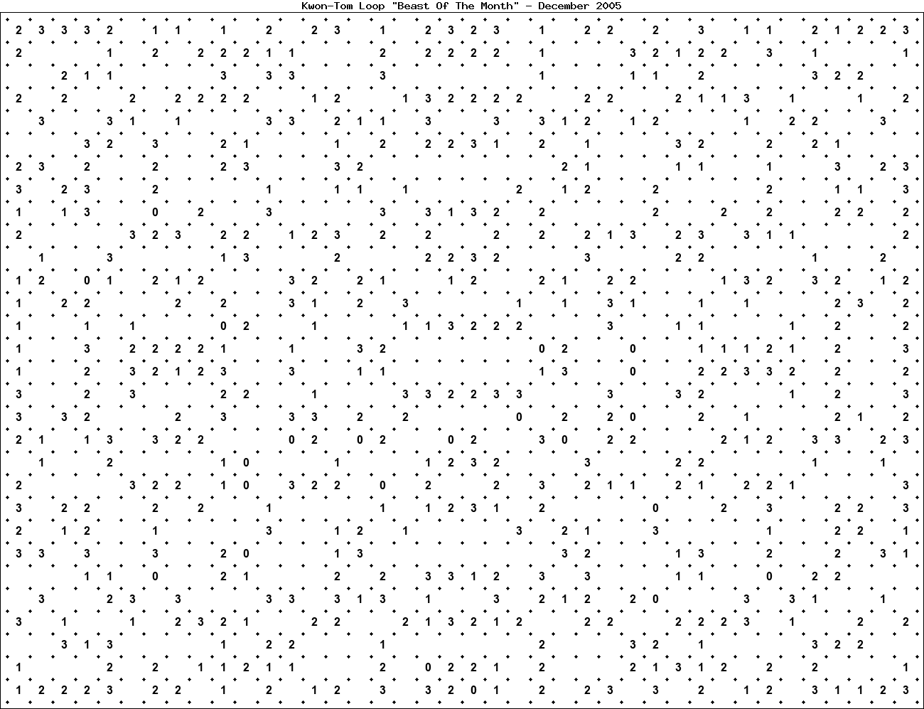 The "Beast Of The Month" is a very large puzzle, too big to display in the usual Kwon-Tom Loop interactive format. It's presented here as an image which you can print off and solve on paper.Printable Beast December 2005(solution)