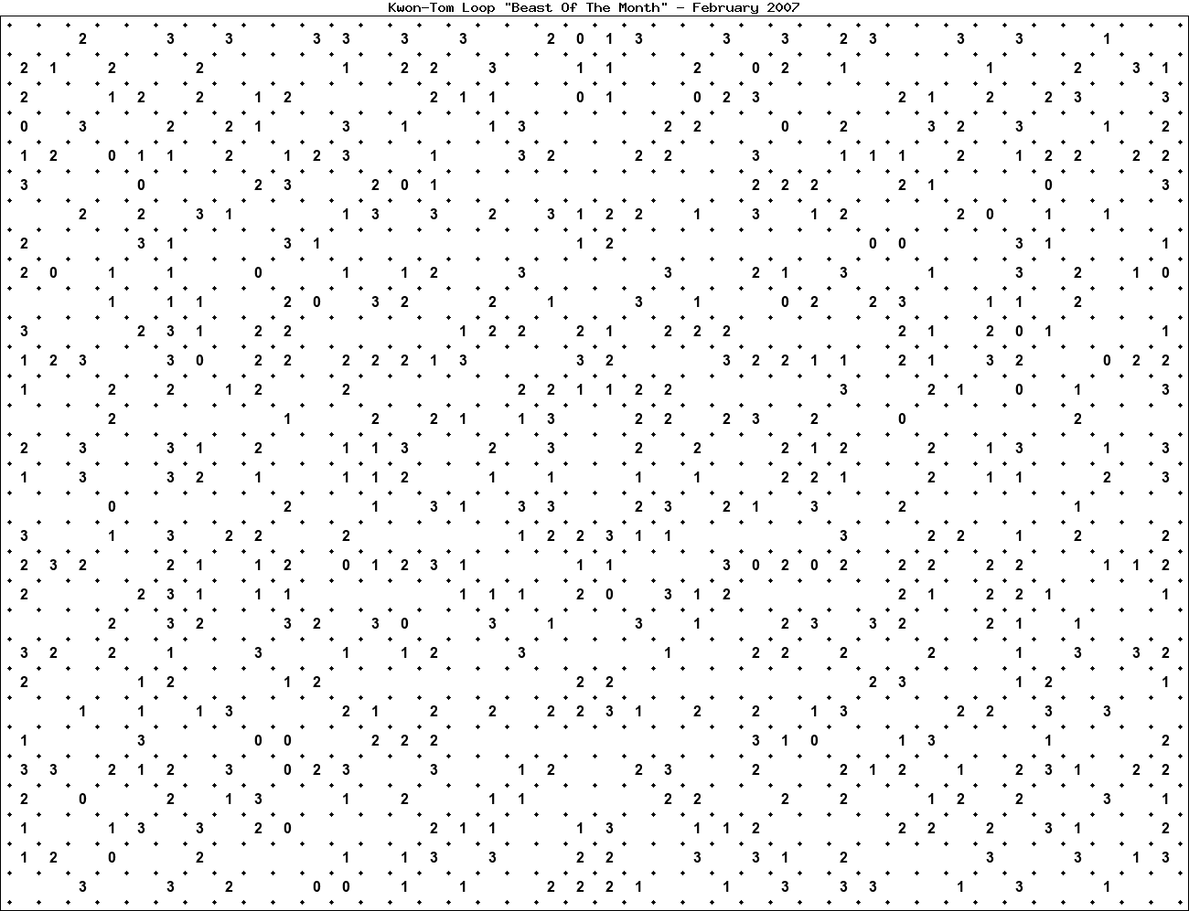 The "Beast Of The Month" is a very large puzzle, too big to display in the usual Kwon-Tom Loop interactive format. It's presented here as an image which you can print off and solve on paper.Printable Beast February 2007(solution)