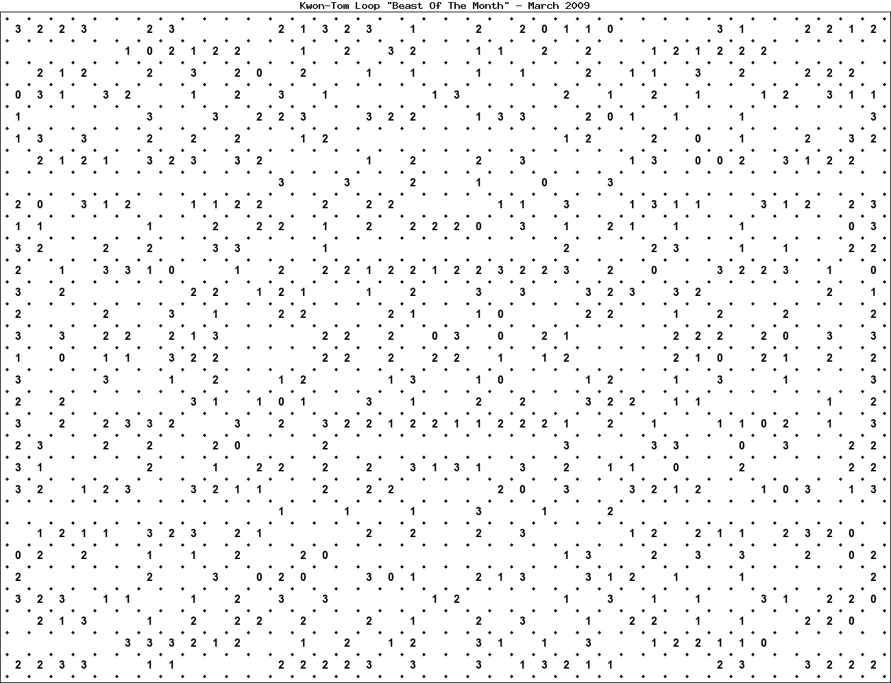 The "Beast Of The Month" is a very large puzzle, too big to display in the usual Kwon-Tom Loop interactive format. It's presented here as an image which you can print off and solve on paper.Printable Beast March 2009(solution)