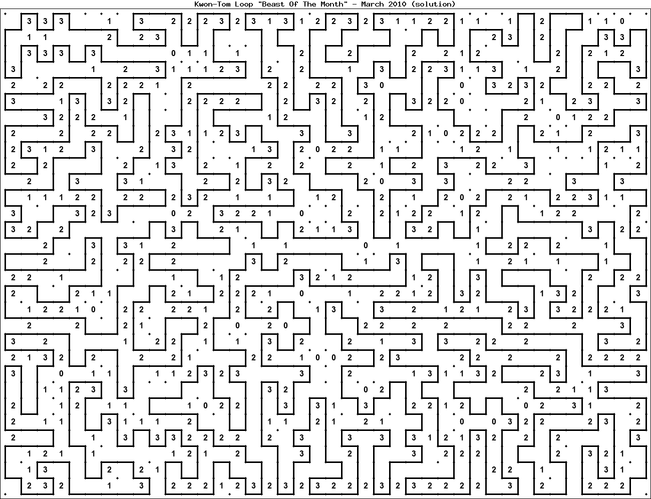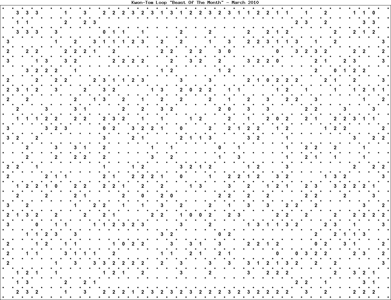 The "Beast Of The Month" is a very large puzzle, too big to display in the usual Kwon-Tom Loop interactive format. It's presented here as an image which you can print off and solve on paper.Printable Beast March 2010(solution)