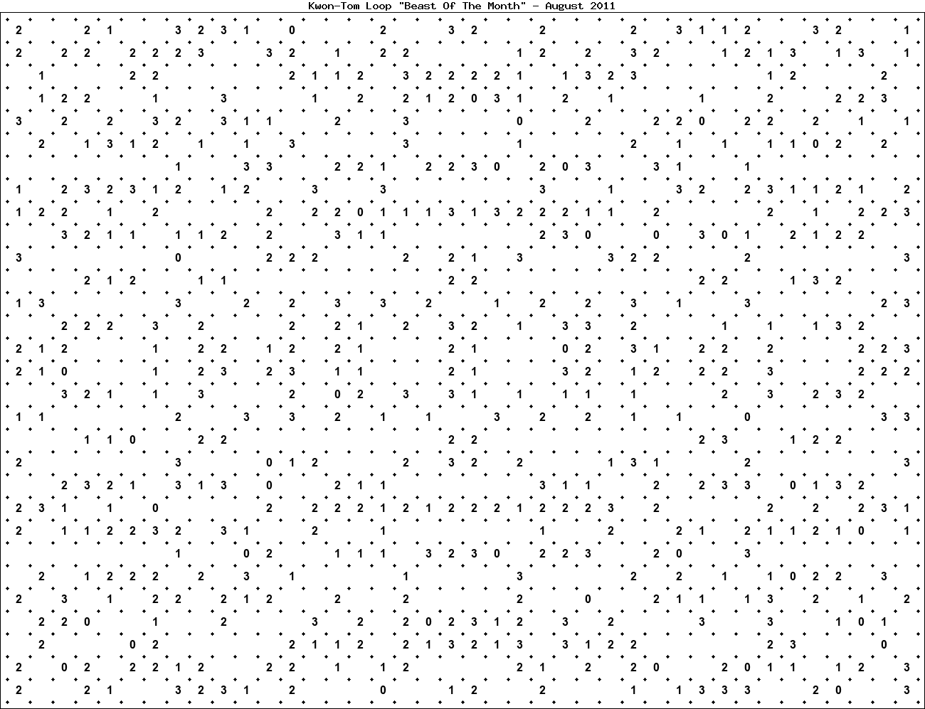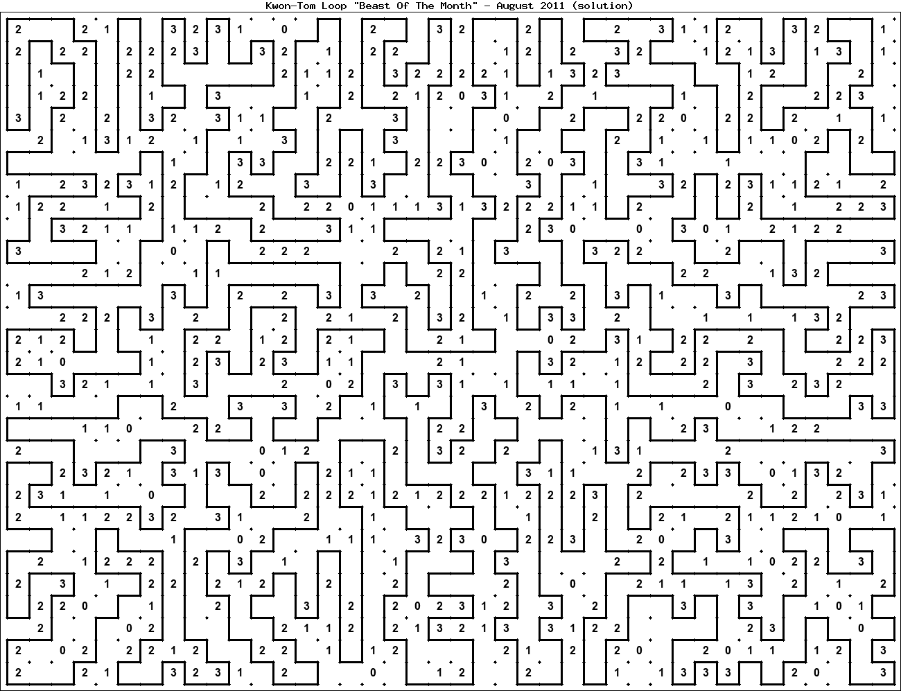 The "Beast Of The Month" is a very large puzzle, too big to display in the usual Kwon-Tom Loop interactive format. It's presented here as an image which you can print off and solve on paper.Printable Beast August 2011(solution)