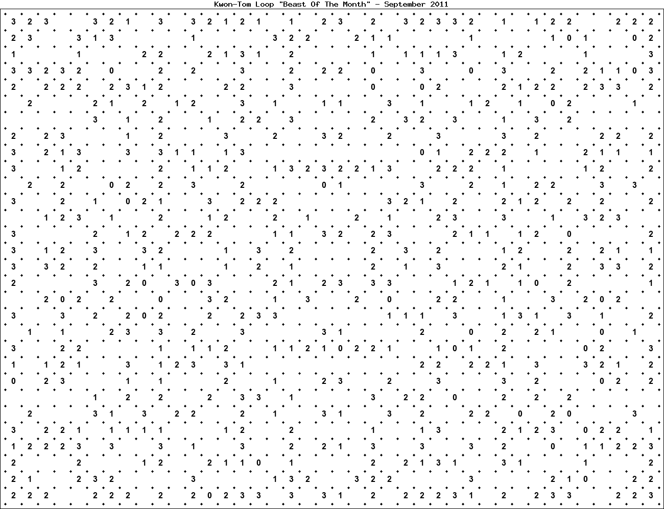 The "Beast Of The Month" is a very large puzzle, too big to display in the usual Kwon-Tom Loop interactive format. It's presented here as an image which you can print off and solve on paper.Printable Beast September 2011(solution)