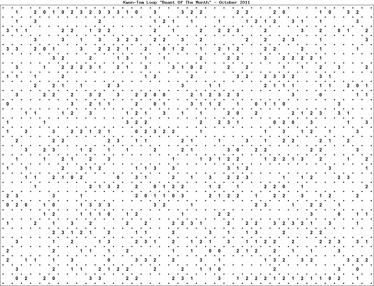 The "Beast Of The Month" is a very large puzzle, too big to display in the usual Kwon-Tom Loop interactive format. It's presented here as an image which you can print off and solve on paper.Printable Beast October 2011(solution)