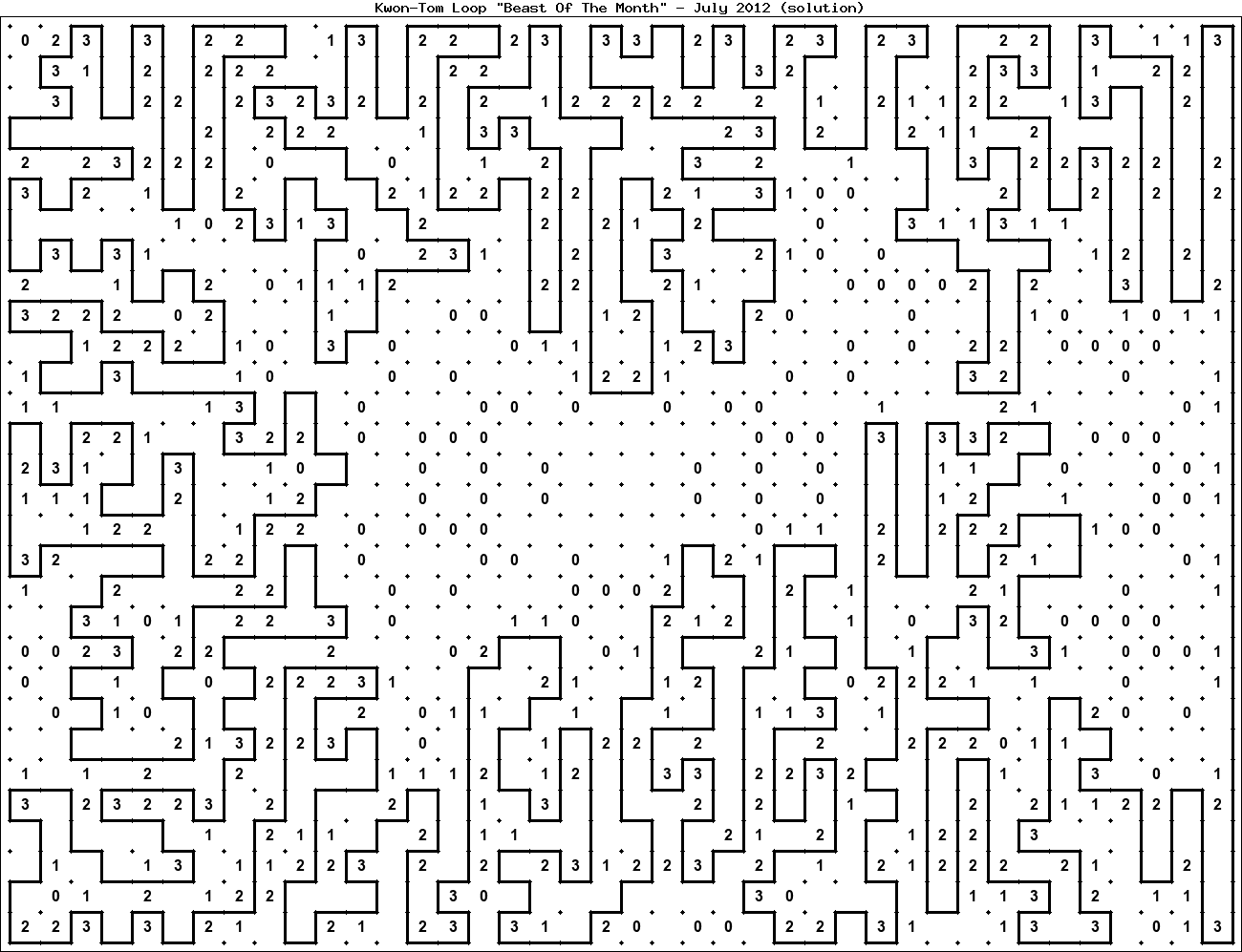 The "Beast Of The Month" is a very large puzzle, too big to display in the usual Kwon-Tom Loop interactive format. It's presented here as an image which you can print off and solve on paper.Printable Beast July 2012(solution)