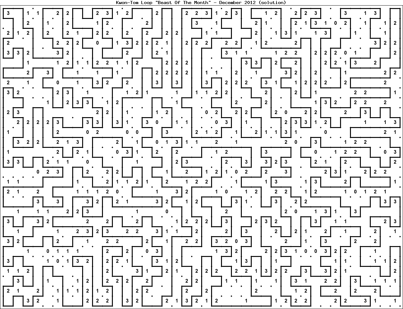 The "Beast Of The Month" is a very large puzzle, too big to display in the usual Kwon-Tom Loop interactive format. It's presented here as an image which you can print off and solve on paper.Printable Beast December 2012(solution)