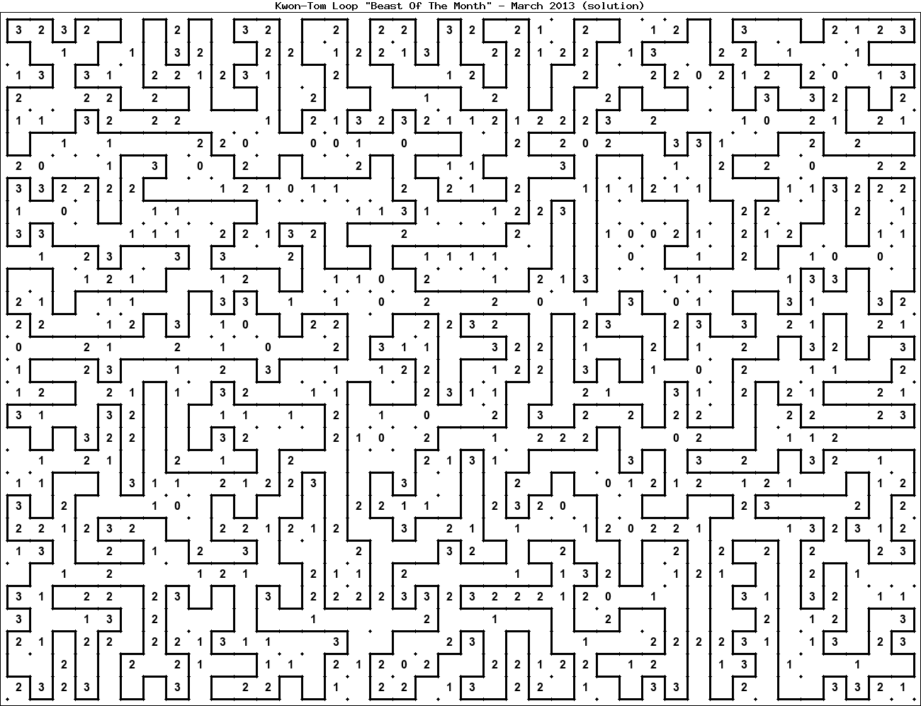 The "Beast Of The Month" is a very large puzzle, too big to display in the usual Kwon-Tom Loop interactive format. It's presented here as an image which you can print off and solve on paper.Printable Beast March 2013(solution)