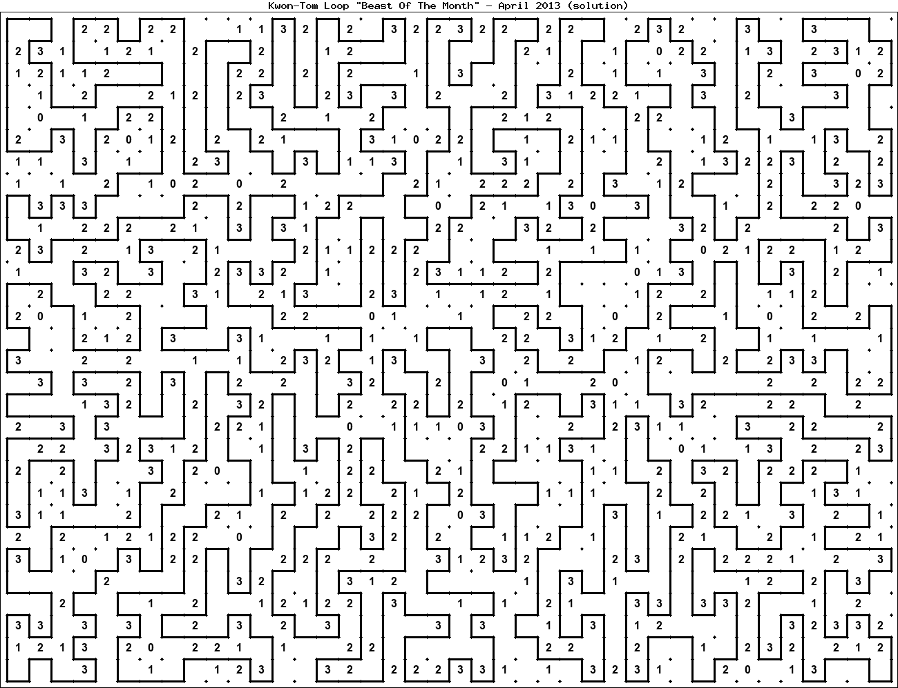 The "Beast Of The Month" is a very large puzzle, too big to display in the usual Kwon-Tom Loop interactive format. It's presented here as an image which you can print off and solve on paper.Printable Beast April 2013(solution)