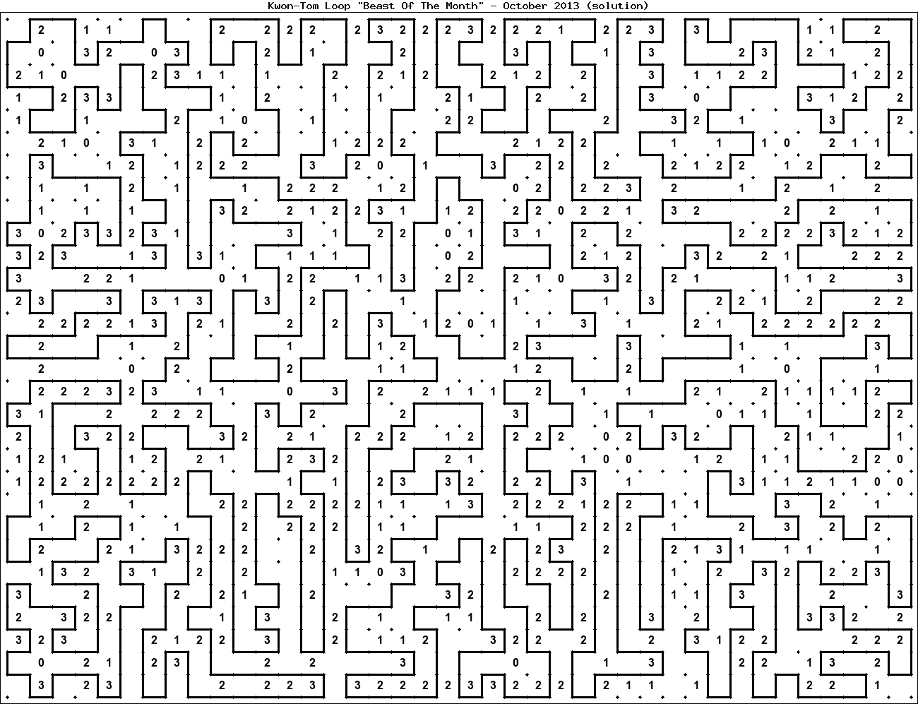 The "Beast Of The Month" is a very large puzzle, too big to display in the usual Kwon-Tom Loop interactive format. It's presented here as an image which you can print off and solve on paper.Printable Beast October 2013(solution)