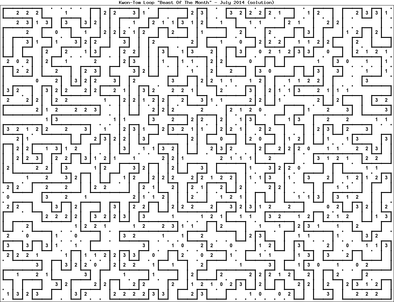The "Beast Of The Month" is a very large puzzle, too big to display in the usual Kwon-Tom Loop interactive format. It's presented here as an image which you can print off and solve on paper.Printable Beast July 2014(solution)