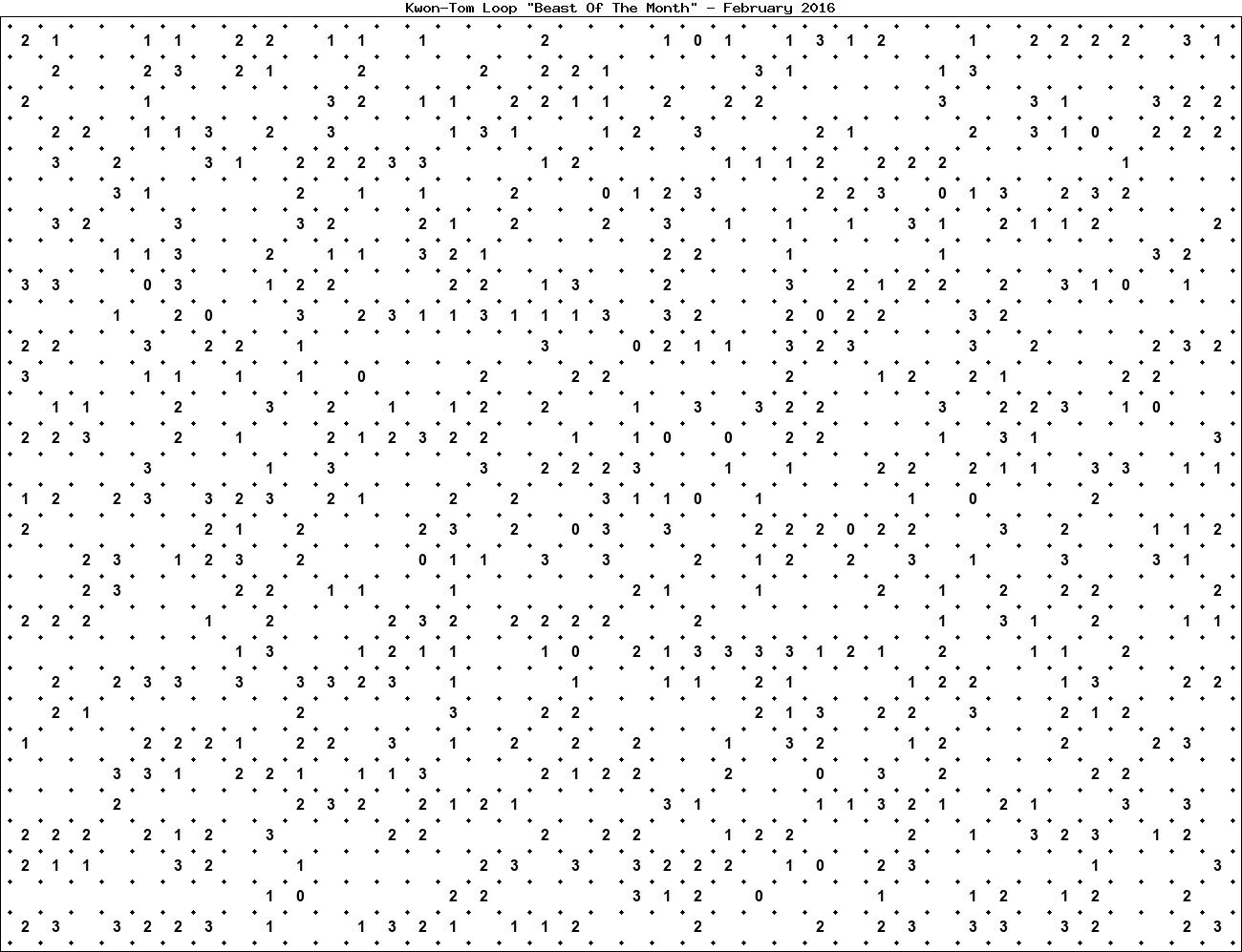 The "Beast Of The Month" is a very large puzzle, too big to display in the usual Kwon-Tom Loop interactive format. It's presented here as an image which you can print off and solve on paper.Printable Beast February 2016(solution)
