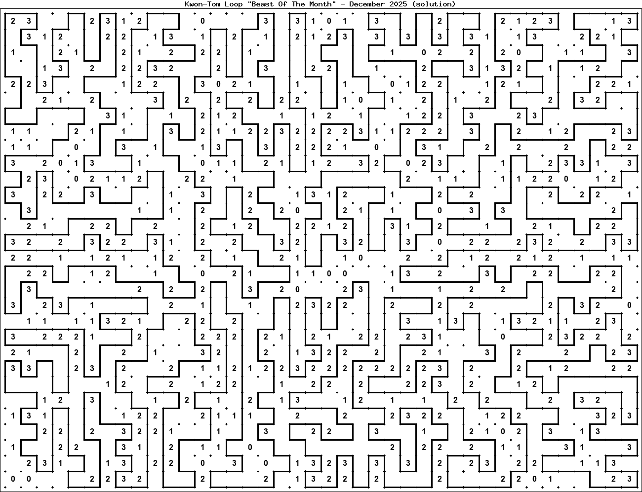 The "Beast Of The Month" is a very large puzzle, too big to display in the usual Kwon-Tom Loop interactive format. It's presented here as an image which you can print off and solve on paper.Printable Beast December 2025(solution)