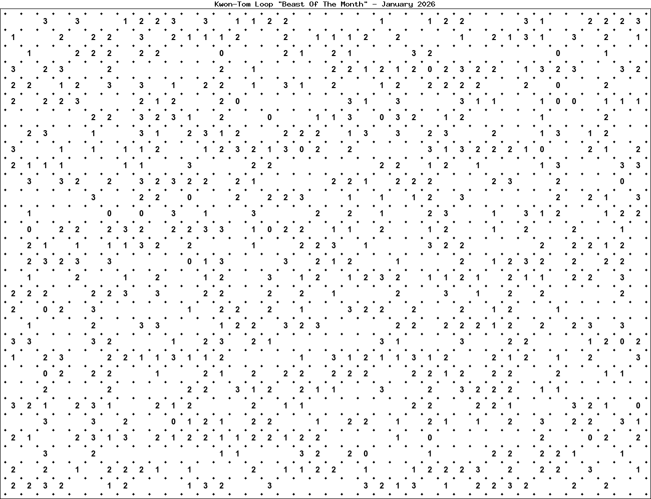 The "Beast Of The Month" is a very large puzzle, too big to display in the usual Kwon-Tom Loop interactive format. It's presented here as an image which you can print off and solve on paper.Printable Beast January 2026(solution)