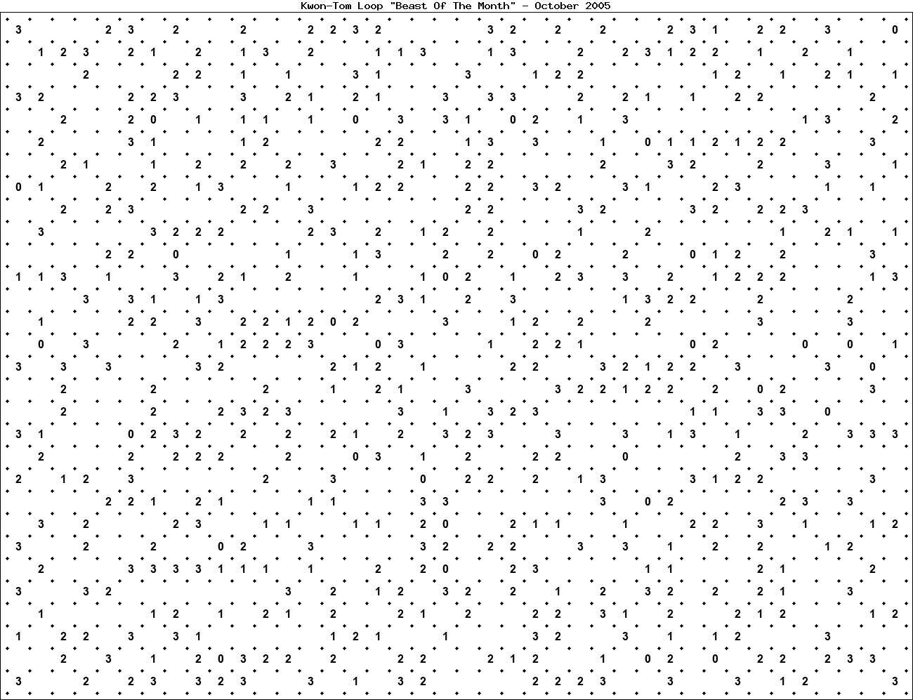 The "Beast Of The Month" is a very large puzzle, too big to display in the usual Kwon-Tom Loop interactive format. It's presented here as an image which you can print off and solve on paper.Printable Beast October 2005(solution)