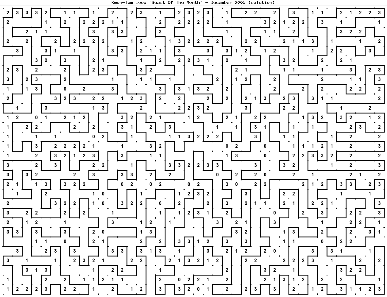 The "Beast Of The Month" is a very large puzzle, too big to display in the usual Kwon-Tom Loop interactive format. It's presented here as an image which you can print off and solve on paper.Printable Beast December 2005(solution)