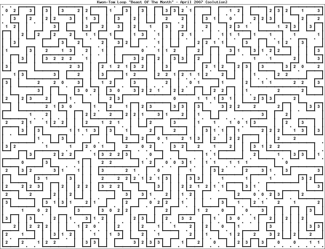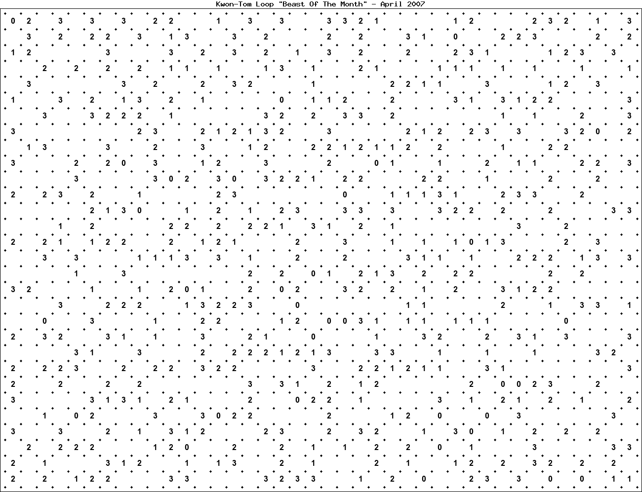 The "Beast Of The Month" is a very large puzzle, too big to display in the usual Kwon-Tom Loop interactive format. It's presented here as an image which you can print off and solve on paper.Printable Beast April 2007(solution)