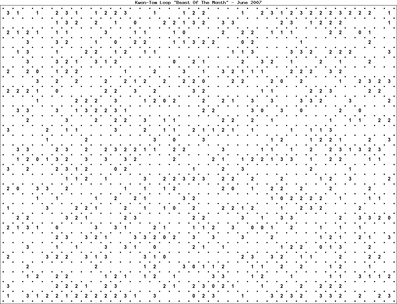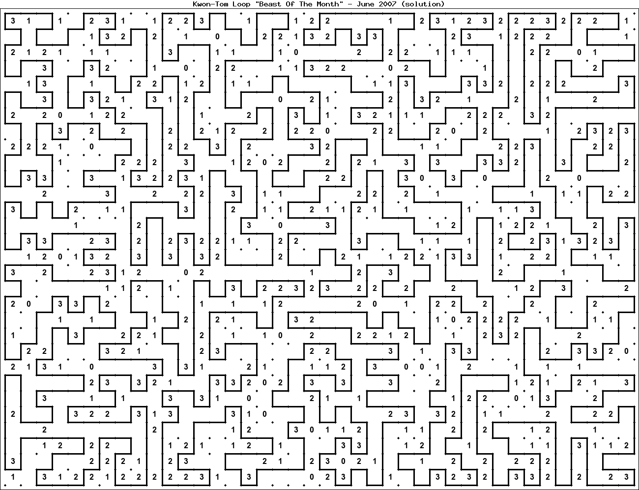 The "Beast Of The Month" is a very large puzzle, too big to display in the usual Kwon-Tom Loop interactive format. It's presented here as an image which you can print off and solve on paper.Printable Beast June 2007(solution)