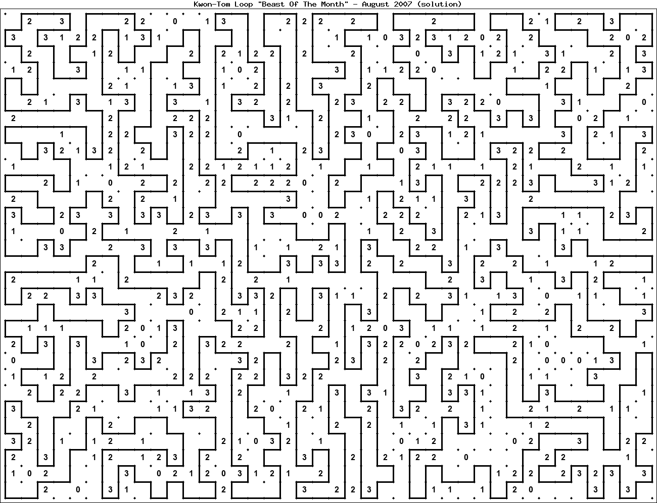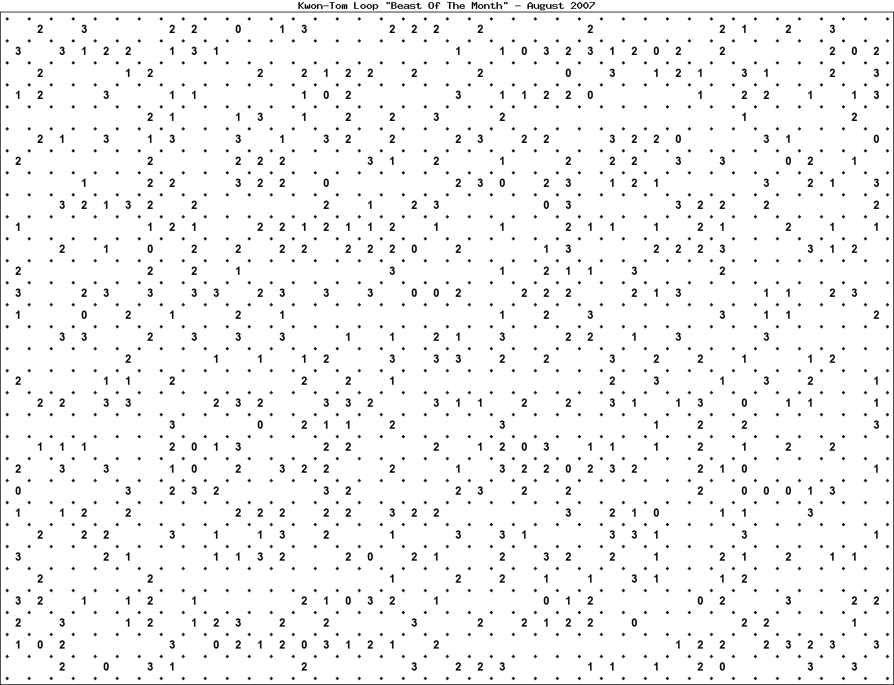 The "Beast Of The Month" is a very large puzzle, too big to display in the usual Kwon-Tom Loop interactive format. It's presented here as an image which you can print off and solve on paper.Printable Beast August 2007(solution)