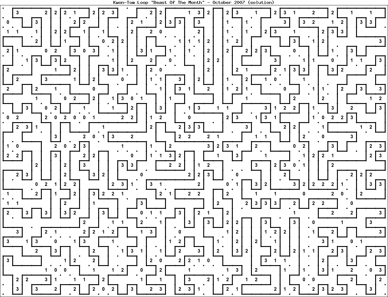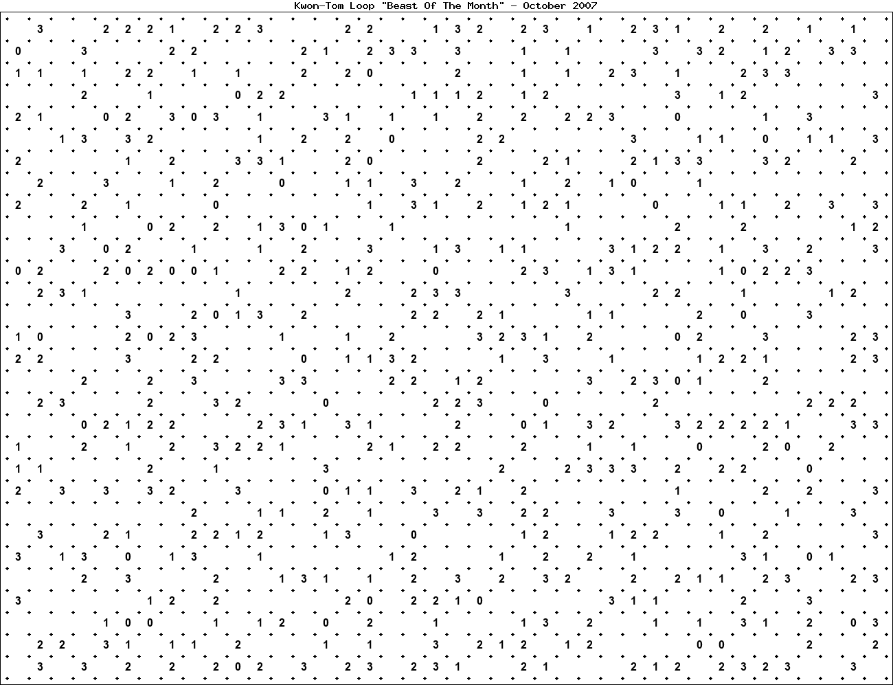 The "Beast Of The Month" is a very large puzzle, too big to display in the usual Kwon-Tom Loop interactive format. It's presented here as an image which you can print off and solve on paper.Printable Beast October 2007(solution)