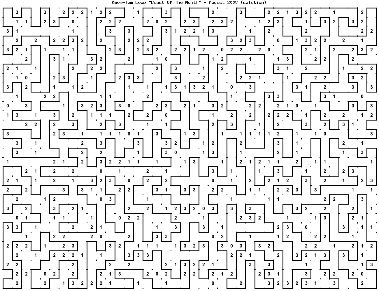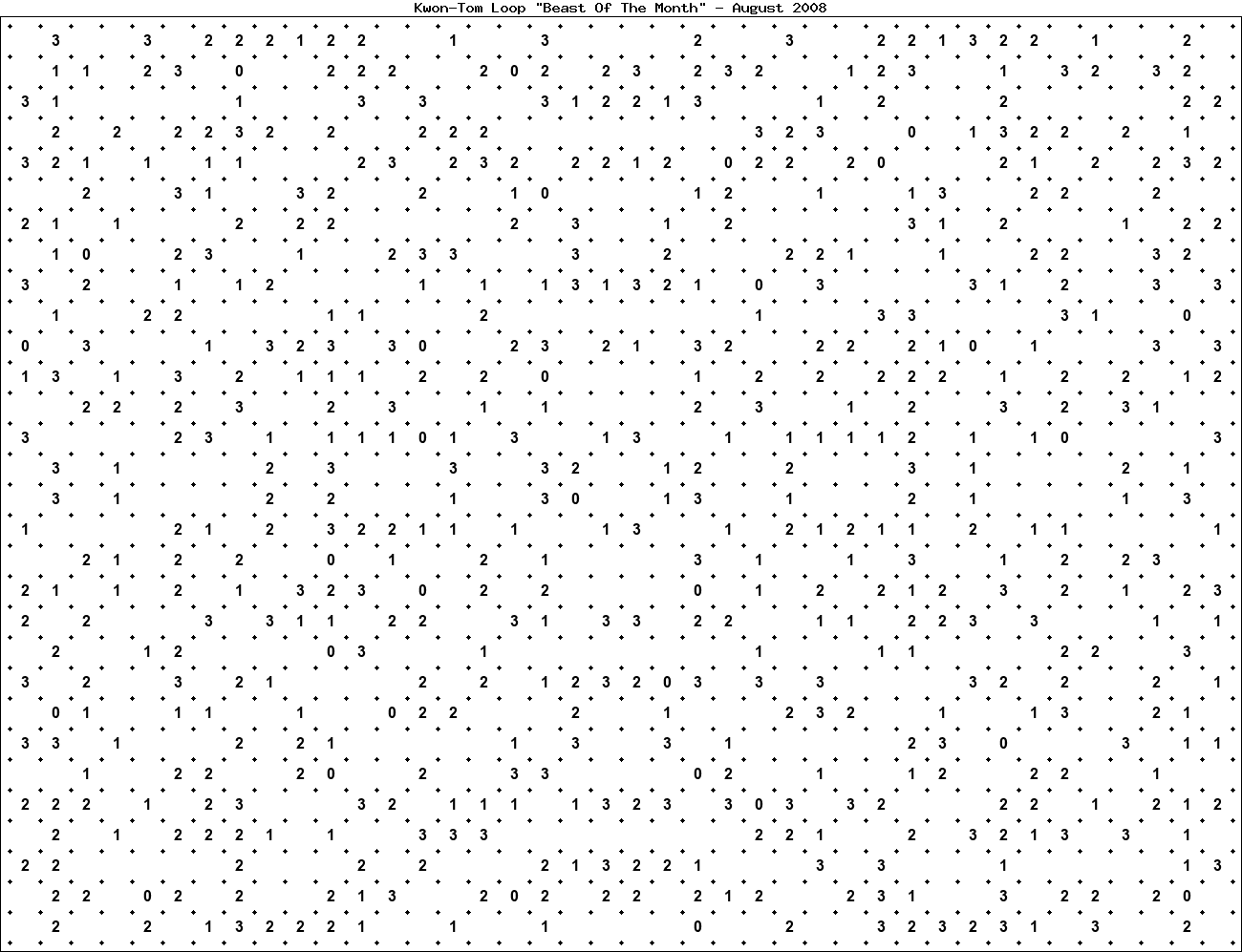 The "Beast Of The Month" is a very large puzzle, too big to display in the usual Kwon-Tom Loop interactive format. It's presented here as an image which you can print off and solve on paper.Printable Beast August 2008(solution)