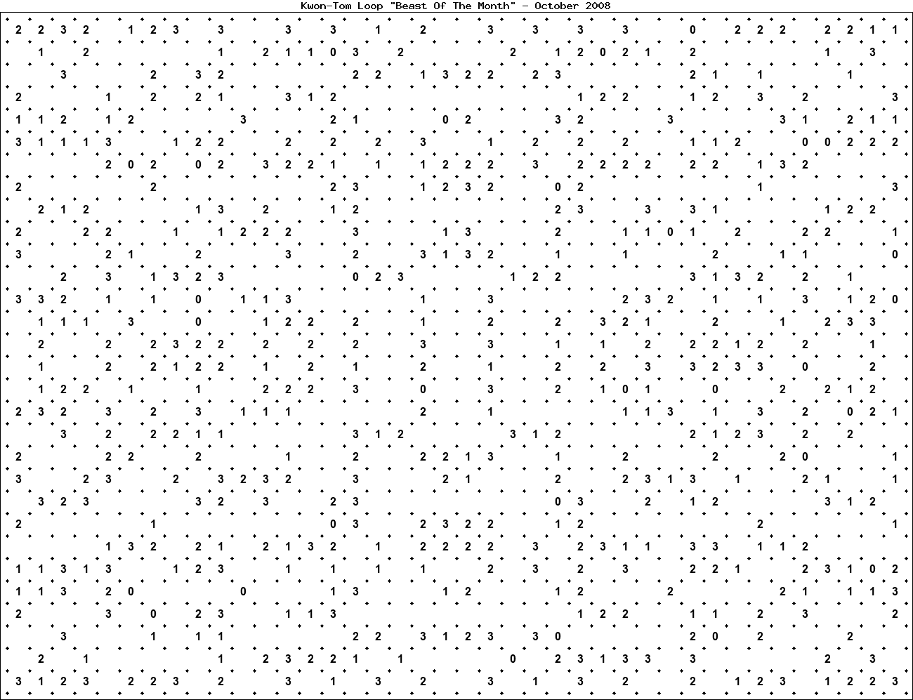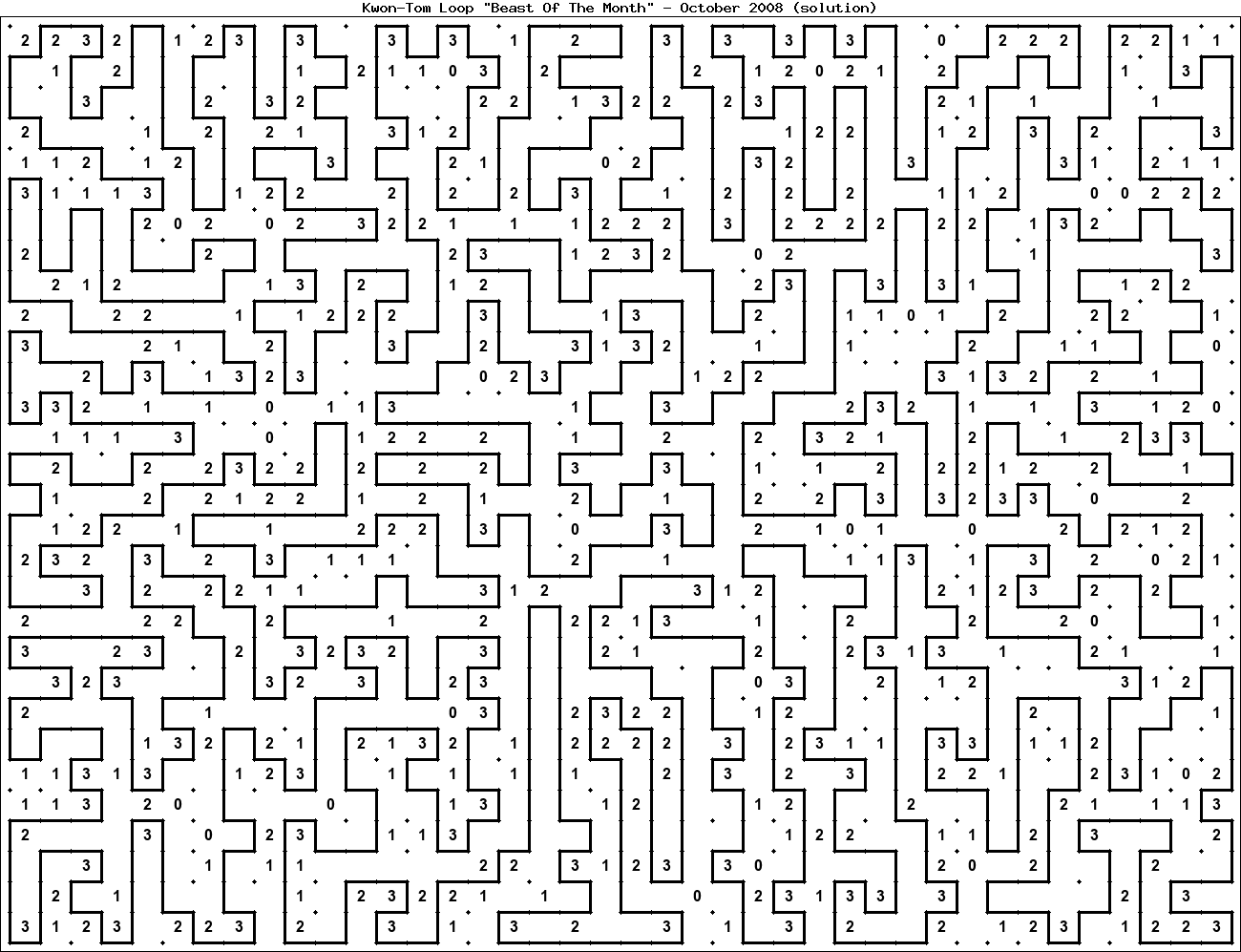 The "Beast Of The Month" is a very large puzzle, too big to display in the usual Kwon-Tom Loop interactive format. It's presented here as an image which you can print off and solve on paper.Printable Beast October 2008(solution)