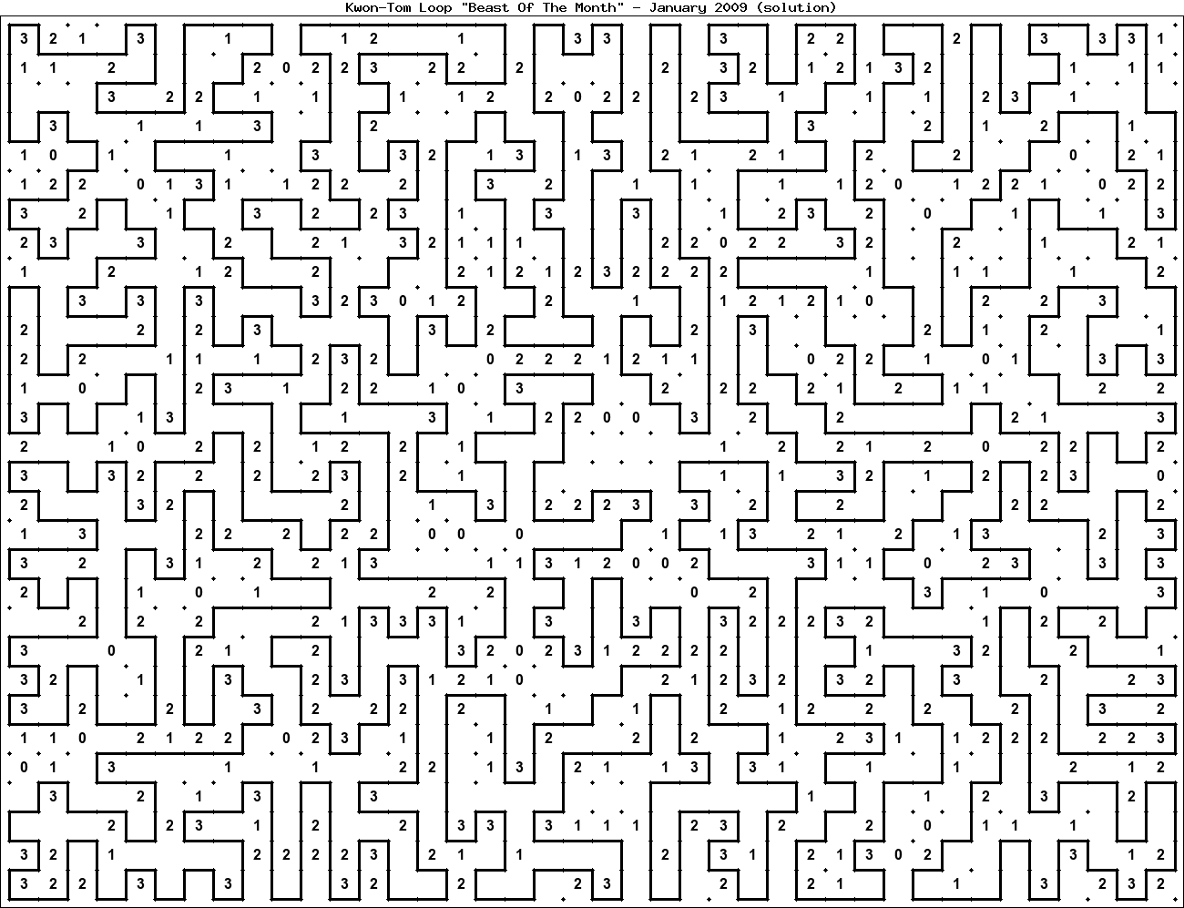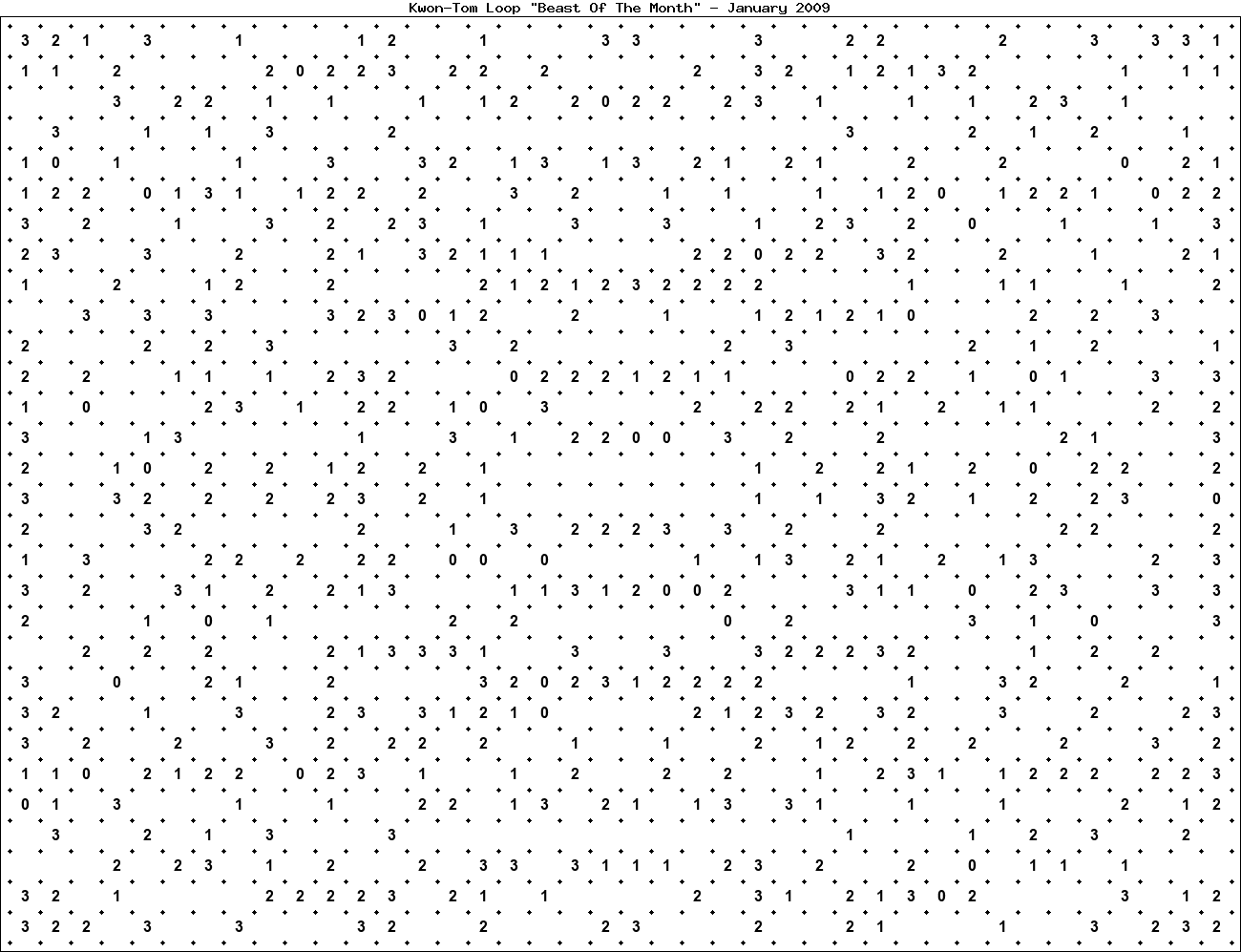 The "Beast Of The Month" is a very large puzzle, too big to display in the usual Kwon-Tom Loop interactive format. It's presented here as an image which you can print off and solve on paper.Printable Beast January 2009(solution)