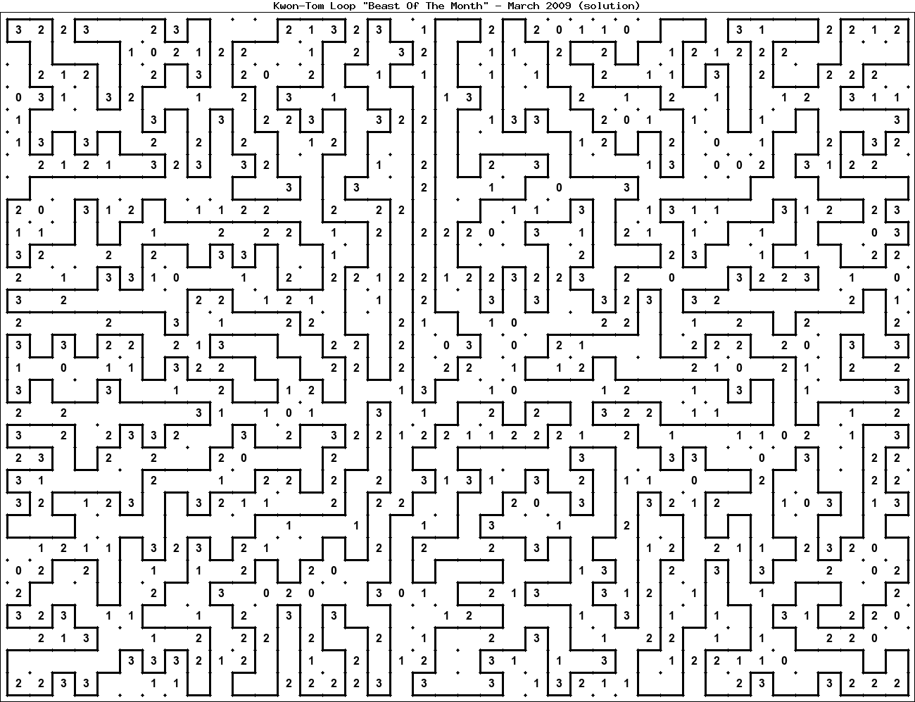 The "Beast Of The Month" is a very large puzzle, too big to display in the usual Kwon-Tom Loop interactive format. It's presented here as an image which you can print off and solve on paper.Printable Beast March 2009(solution)
