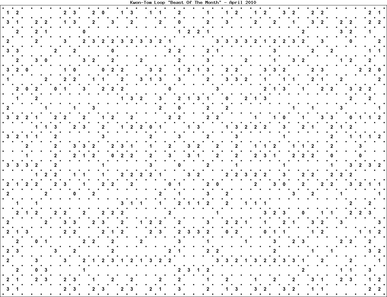 The "Beast Of The Month" is a very large puzzle, too big to display in the usual Kwon-Tom Loop interactive format. It's presented here as an image which you can print off and solve on paper.Printable Beast April 2010(solution)