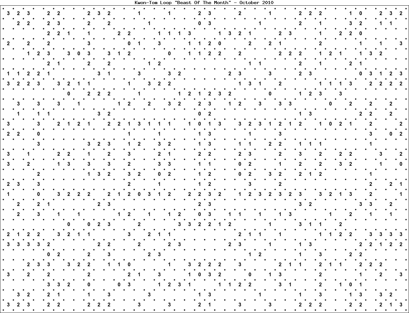 The "Beast Of The Month" is a very large puzzle, too big to display in the usual Kwon-Tom Loop interactive format. It's presented here as an image which you can print off and solve on paper.Printable Beast October 2010(solution)