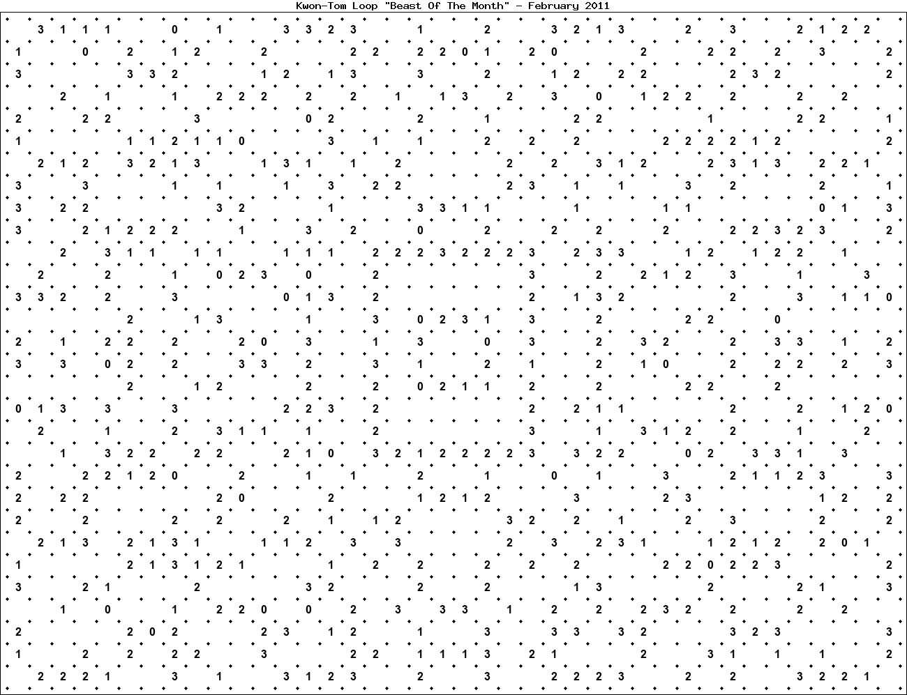 The "Beast Of The Month" is a very large puzzle, too big to display in the usual Kwon-Tom Loop interactive format. It's presented here as an image which you can print off and solve on paper.Printable Beast February 2011(solution)