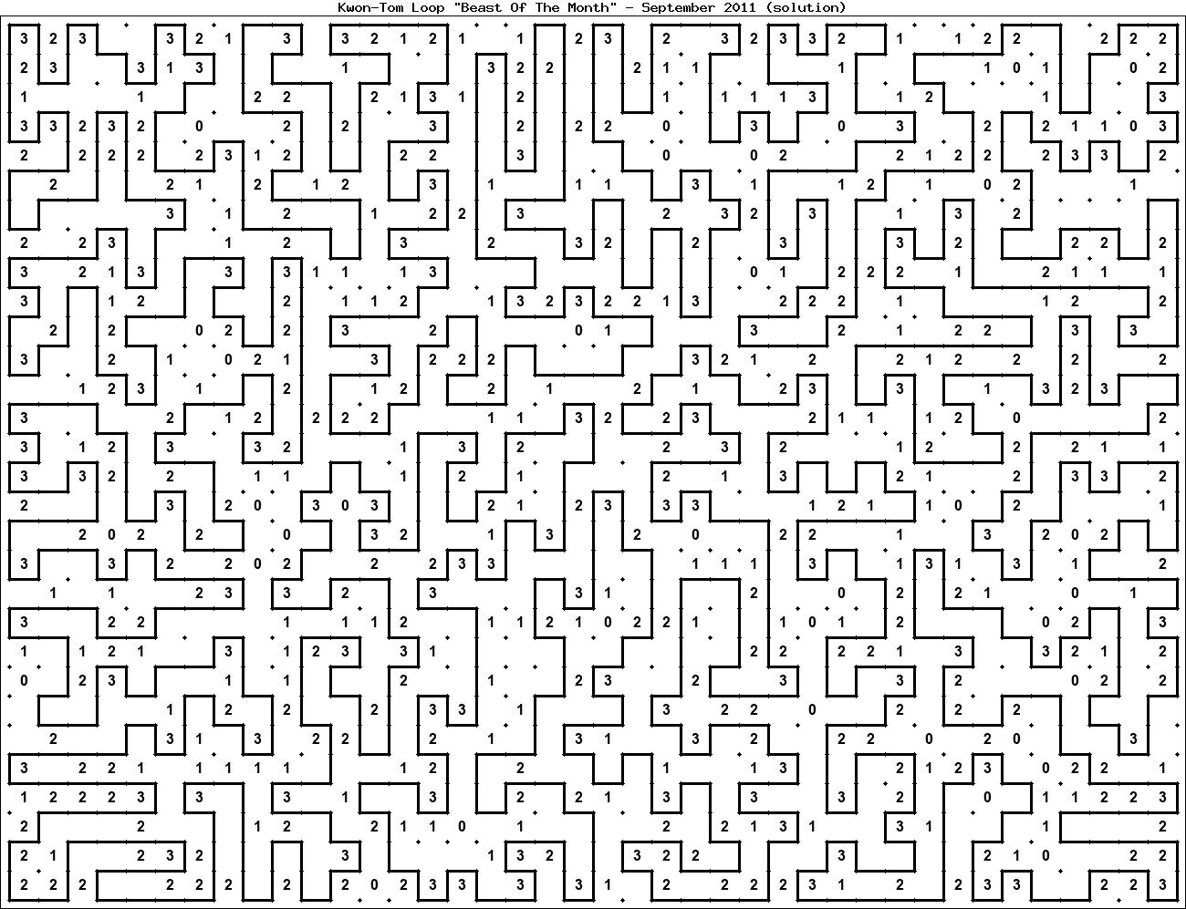 The "Beast Of The Month" is a very large puzzle, too big to display in the usual Kwon-Tom Loop interactive format. It's presented here as an image which you can print off and solve on paper.Printable Beast September 2011(solution)