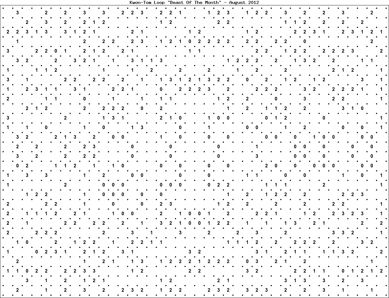 The "Beast Of The Month" is a very large puzzle, too big to display in the usual Kwon-Tom Loop interactive format. It's presented here as an image which you can print off and solve on paper.Printable Beast August 2012(solution)