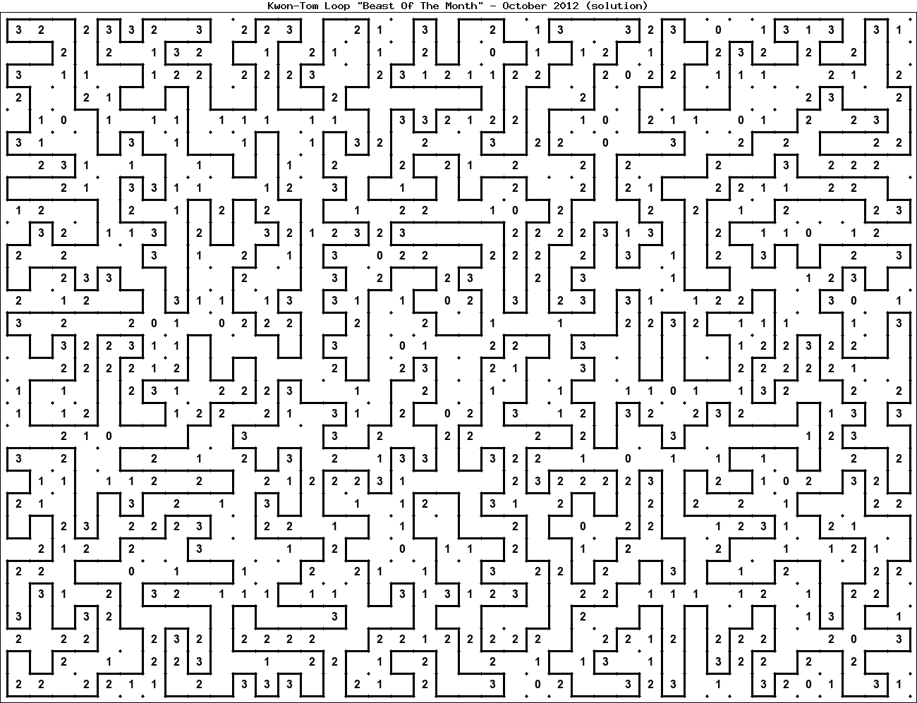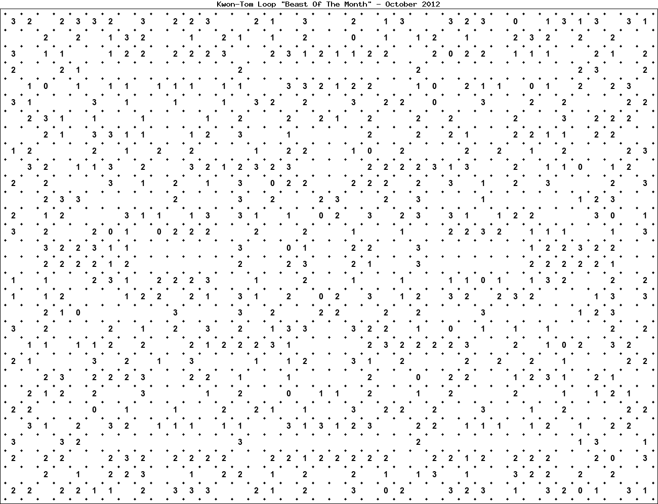 The "Beast Of The Month" is a very large puzzle, too big to display in the usual Kwon-Tom Loop interactive format. It's presented here as an image which you can print off and solve on paper.Printable Beast October 2012(solution)