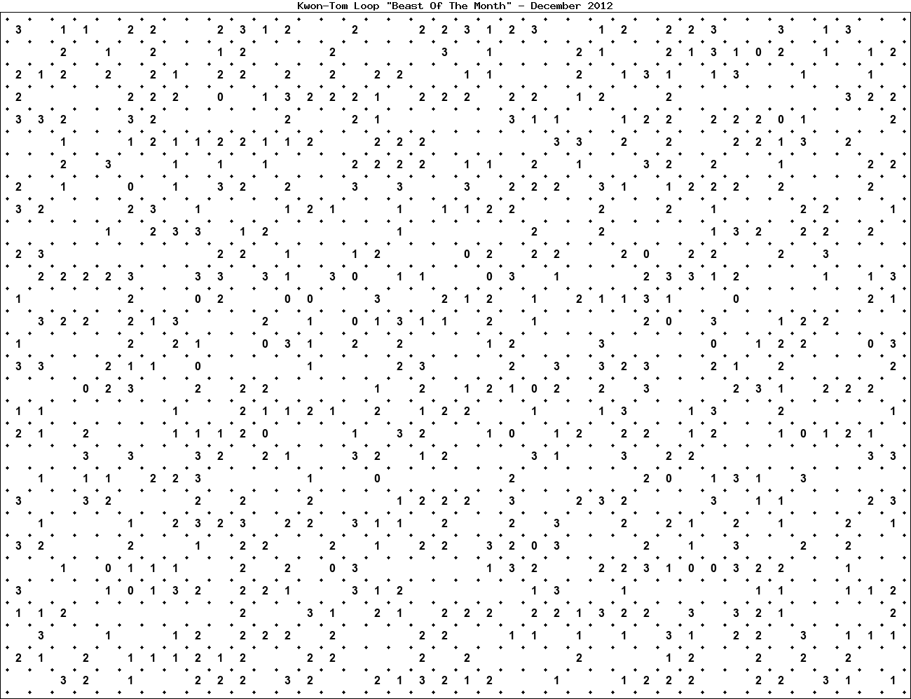 The "Beast Of The Month" is a very large puzzle, too big to display in the usual Kwon-Tom Loop interactive format. It's presented here as an image which you can print off and solve on paper.Printable Beast December 2012(solution)