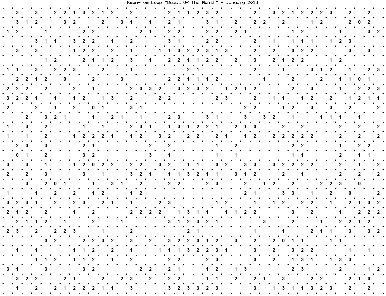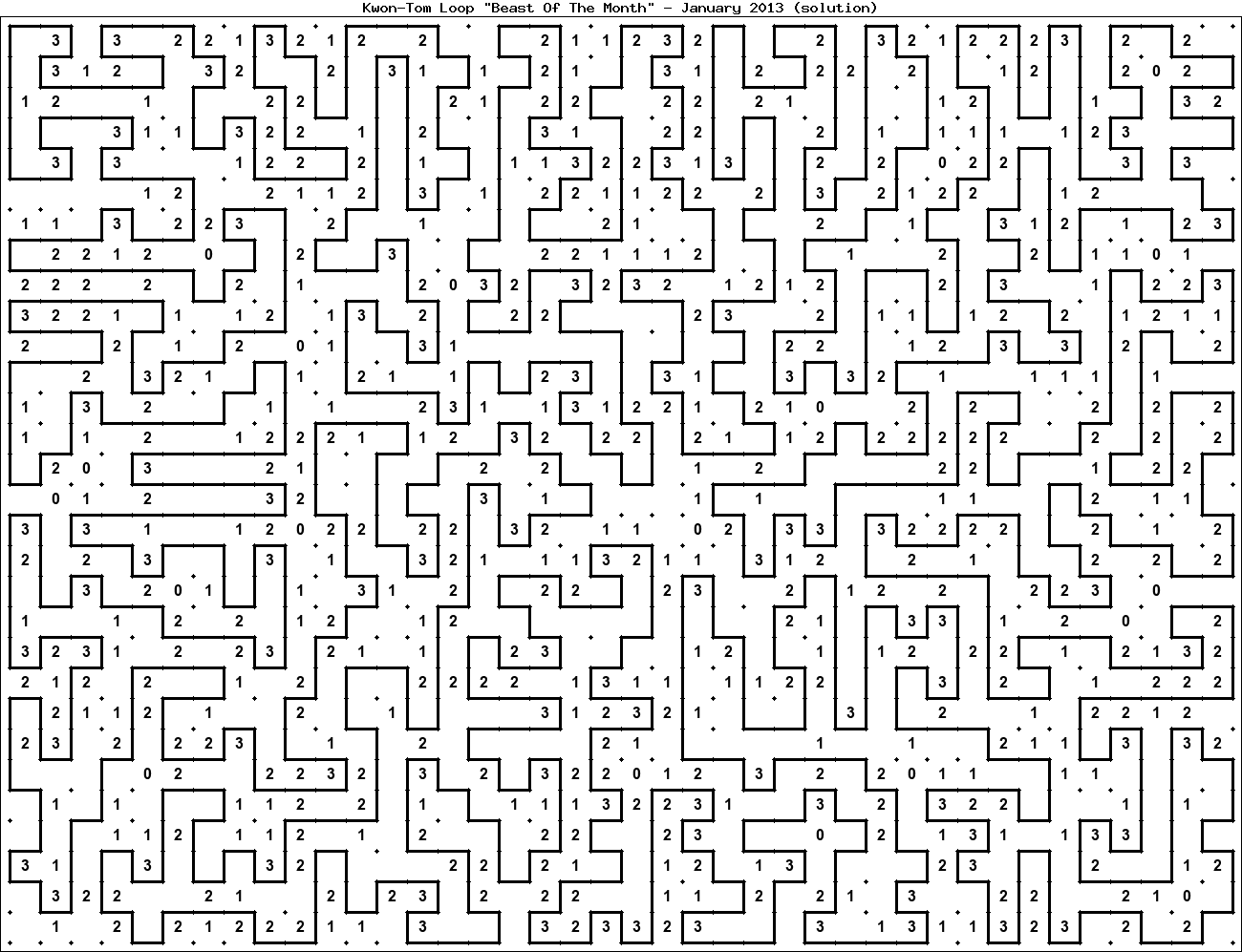 The "Beast Of The Month" is a very large puzzle, too big to display in the usual Kwon-Tom Loop interactive format. It's presented here as an image which you can print off and solve on paper.Printable Beast January 2013(solution)