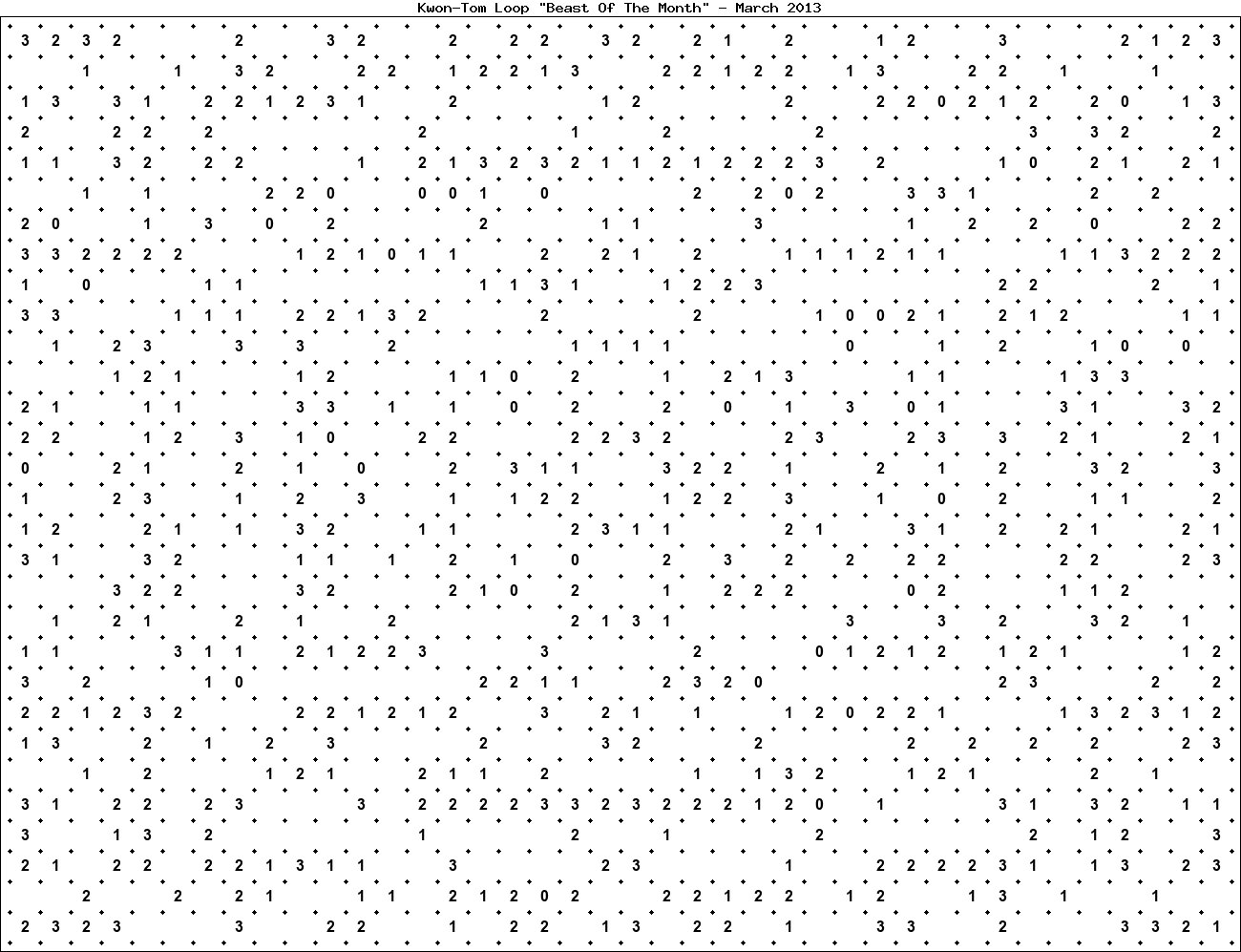 The "Beast Of The Month" is a very large puzzle, too big to display in the usual Kwon-Tom Loop interactive format. It's presented here as an image which you can print off and solve on paper.Printable Beast March 2013(solution)
