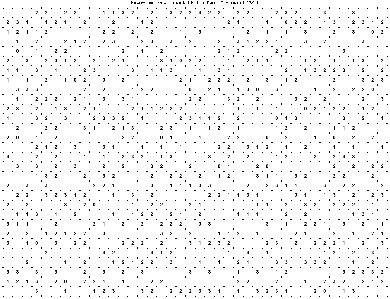 The "Beast Of The Month" is a very large puzzle, too big to display in the usual Kwon-Tom Loop interactive format. It's presented here as an image which you can print off and solve on paper.Printable Beast April 2013(solution)