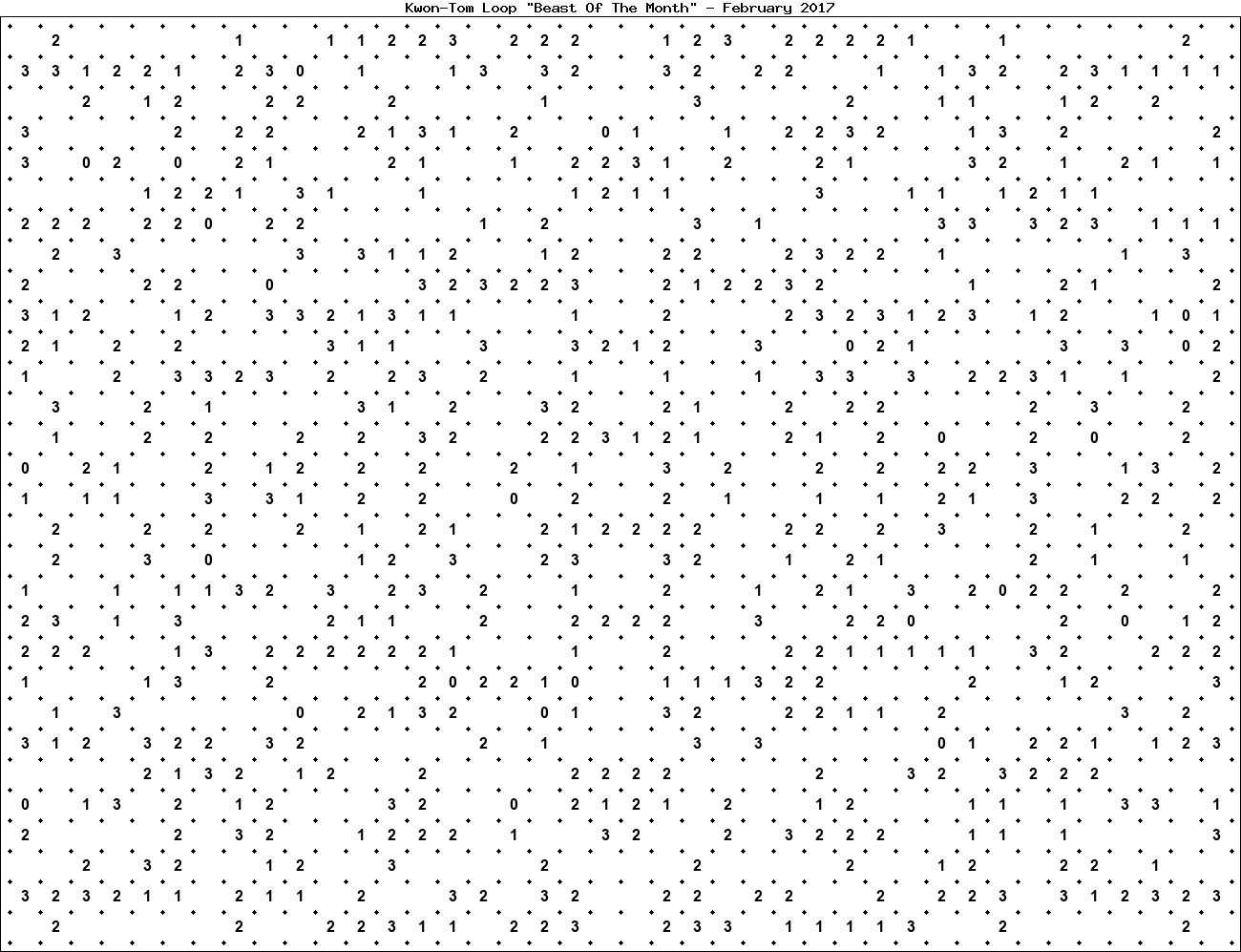 The "Beast Of The Month" is a very large puzzle, too big to display in the usual Kwon-Tom Loop interactive format. It's presented here as an image which you can print off and solve on paper.Printable Beast February 2017(solution)