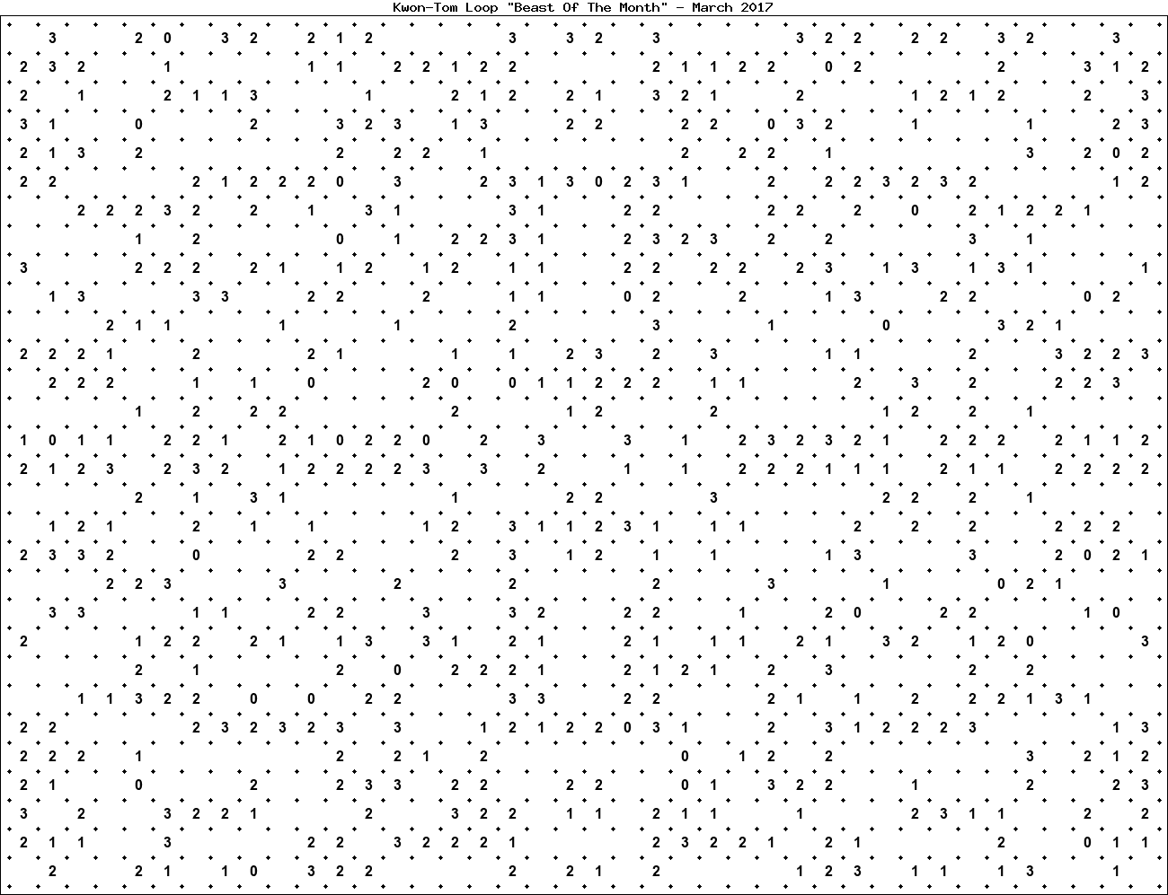 The "Beast Of The Month" is a very large puzzle, too big to display in the usual Kwon-Tom Loop interactive format. It's presented here as an image which you can print off and solve on paper.Printable Beast March 2017(solution)