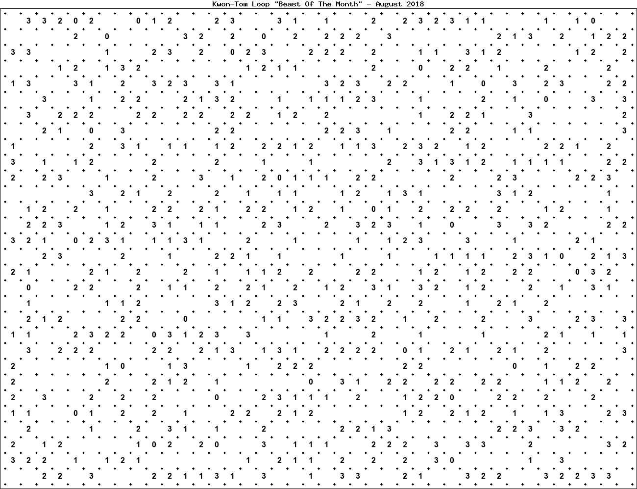 The "Beast Of The Month" is a very large puzzle, too big to display in the usual Kwon-Tom Loop interactive format. It's presented here as an image which you can print off and solve on paper.Printable Beast August 2018(solution)
