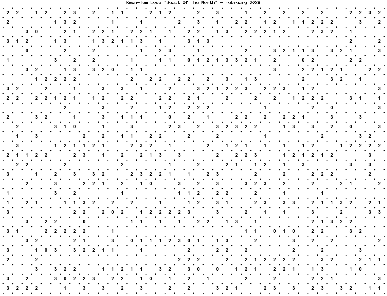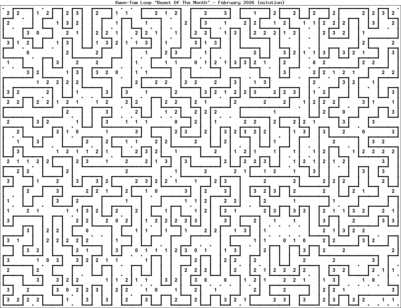 The "Beast Of The Month" is a very large puzzle, too big to display in the usual Kwon-Tom Loop interactive format. It's presented here as an image which you can print off and solve on paper.Printable Beast February 2026(solution)