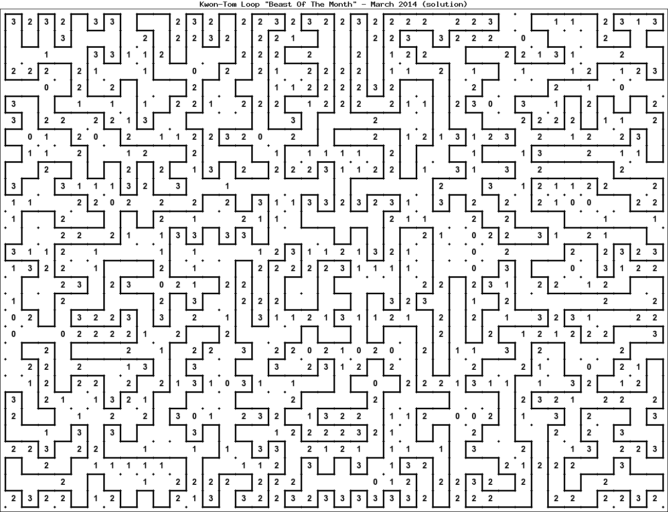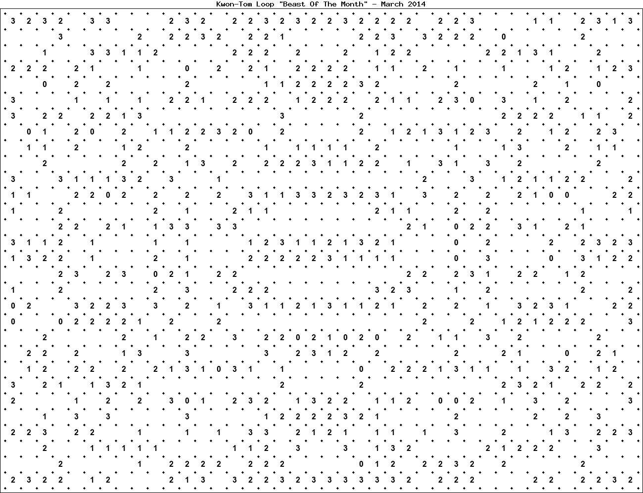 The "Beast Of The Month" is a very large puzzle, too big to display in the usual Kwon-Tom Loop interactive format. It's presented here as an image which you can print off and solve on paper.Printable Beast March 2014(solution)