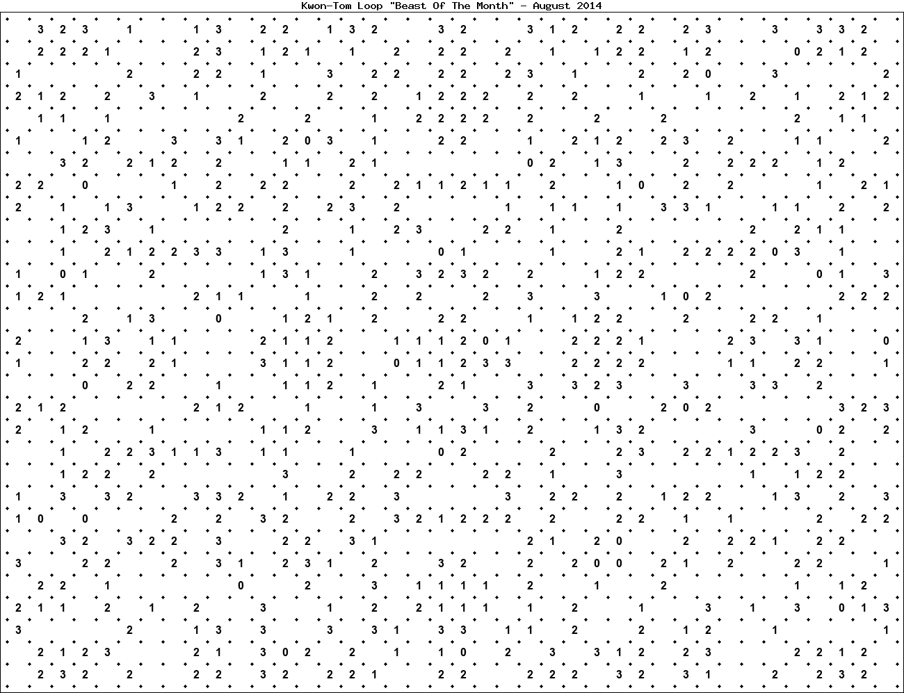 The "Beast Of The Month" is a very large puzzle, too big to display in the usual Kwon-Tom Loop interactive format. It's presented here as an image which you can print off and solve on paper.Printable Beast August 2014(solution)
