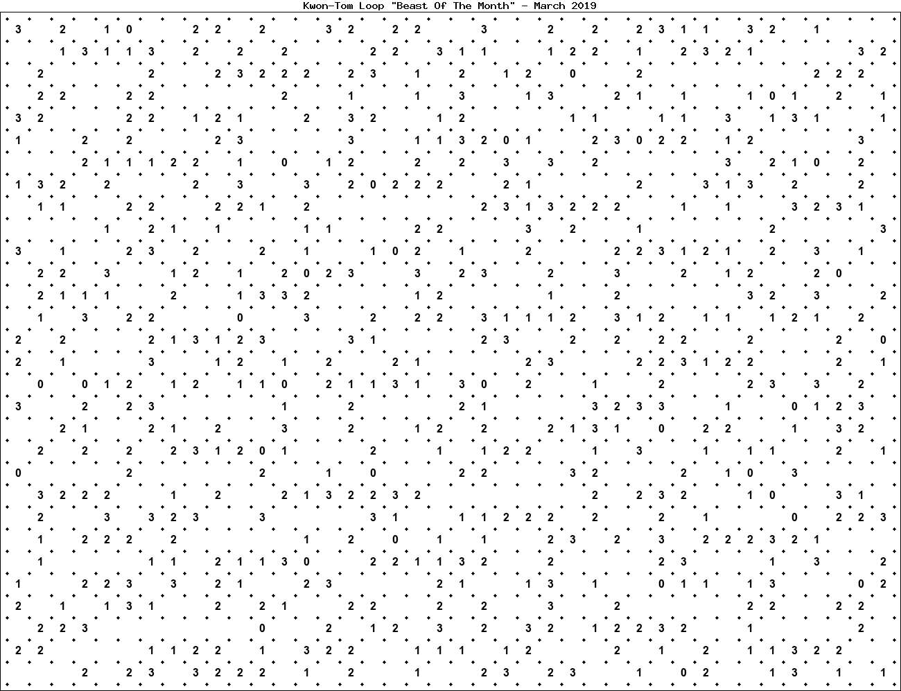 The "Beast Of The Month" is a very large puzzle, too big to display in the usual Kwon-Tom Loop interactive format. It's presented here as an image which you can print off and solve on paper.Printable Beast March 2019(solution)