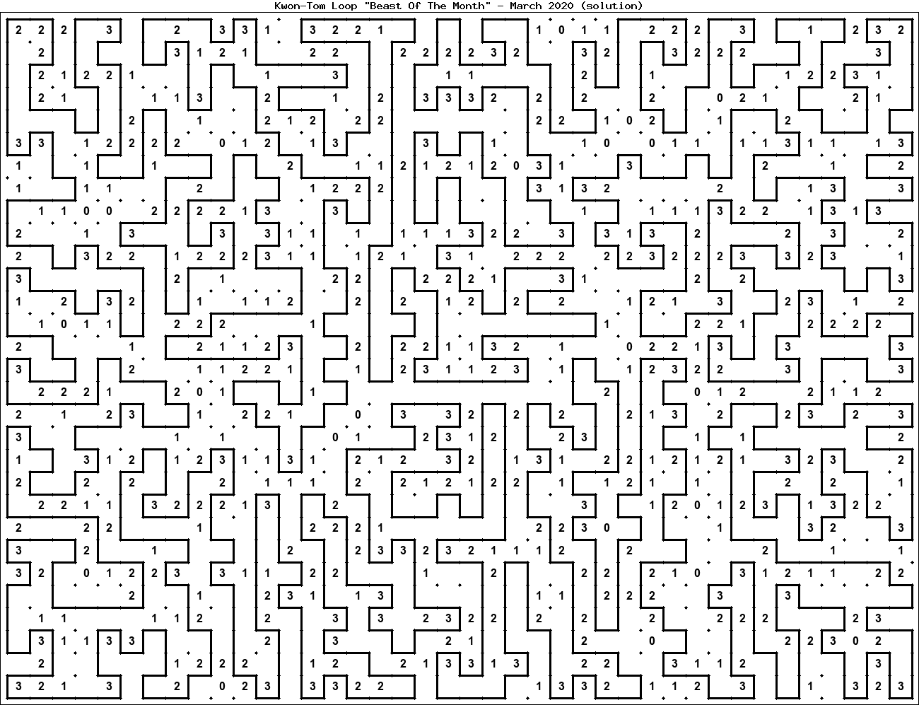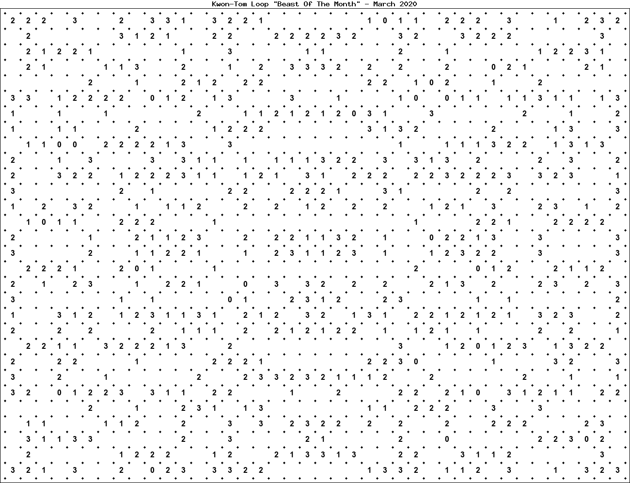The "Beast Of The Month" is a very large puzzle, too big to display in the usual Kwon-Tom Loop interactive format. It's presented here as an image which you can print off and solve on paper.Printable Beast March 2020(solution)