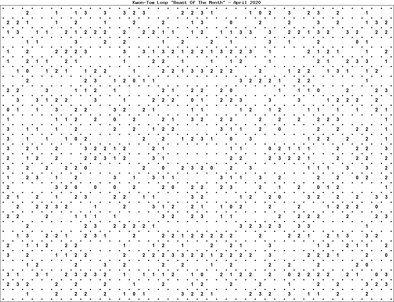 The "Beast Of The Month" is a very large puzzle, too big to display in the usual Kwon-Tom Loop interactive format. It's presented here as an image which you can print off and solve on paper.Printable Beast April 2020(solution)