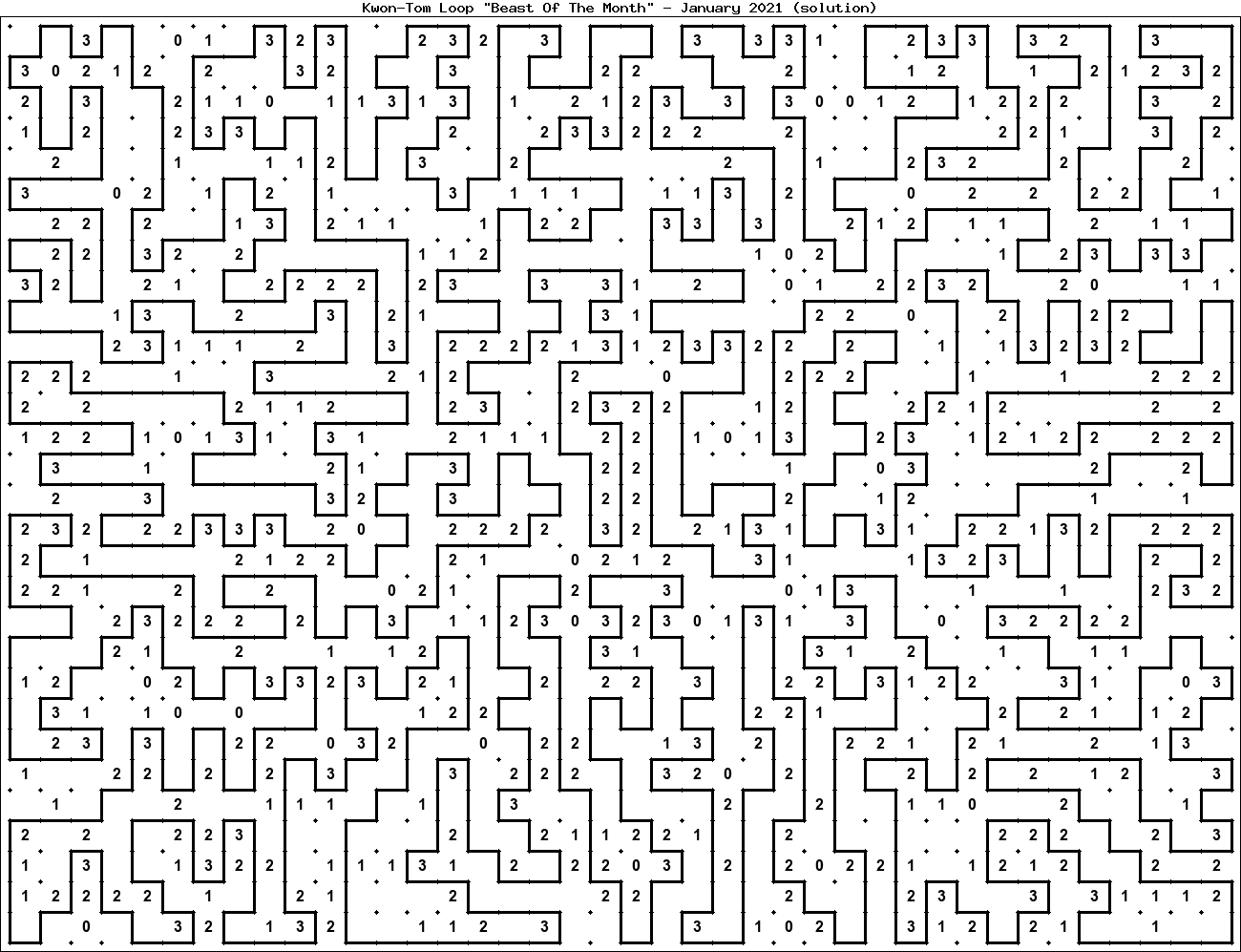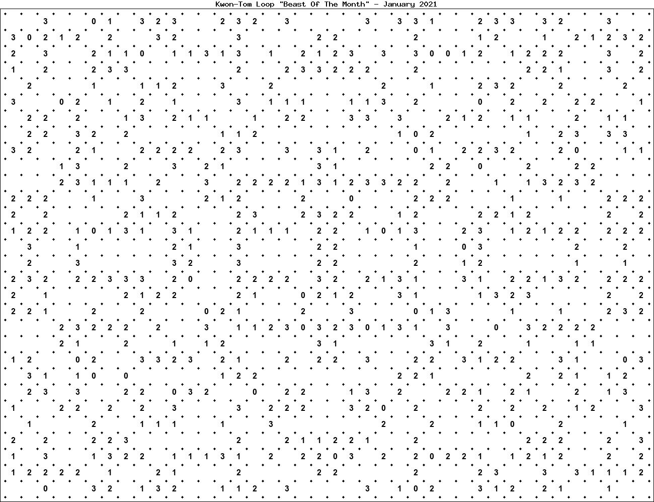 The "Beast Of The Month" is a very large puzzle, too big to display in the usual Kwon-Tom Loop interactive format. It's presented here as an image which you can print off and solve on paper.Printable Beast January 2021(solution)