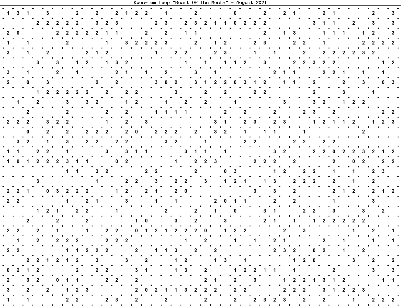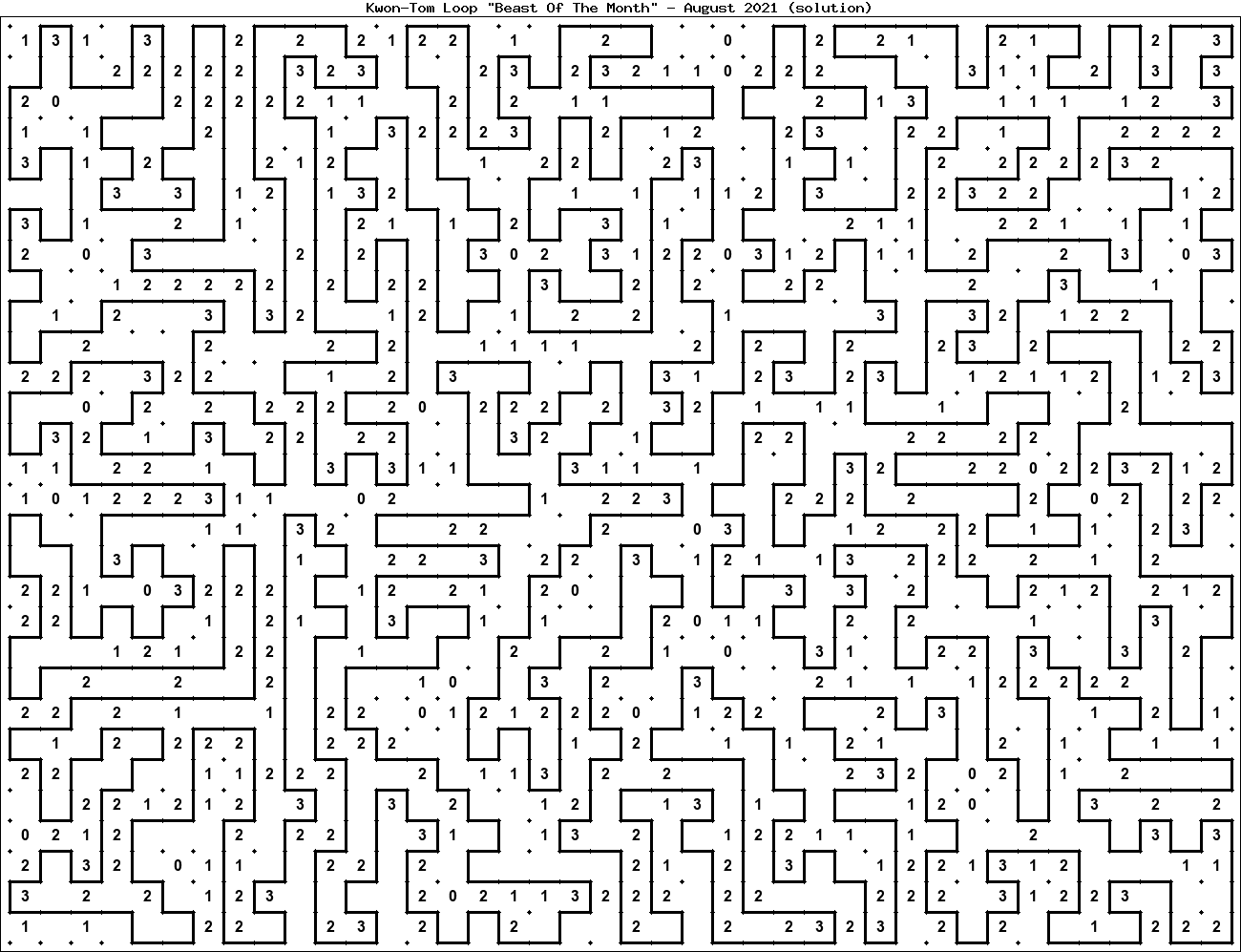 The "Beast Of The Month" is a very large puzzle, too big to display in the usual Kwon-Tom Loop interactive format. It's presented here as an image which you can print off and solve on paper.Printable Beast August 2021(solution)